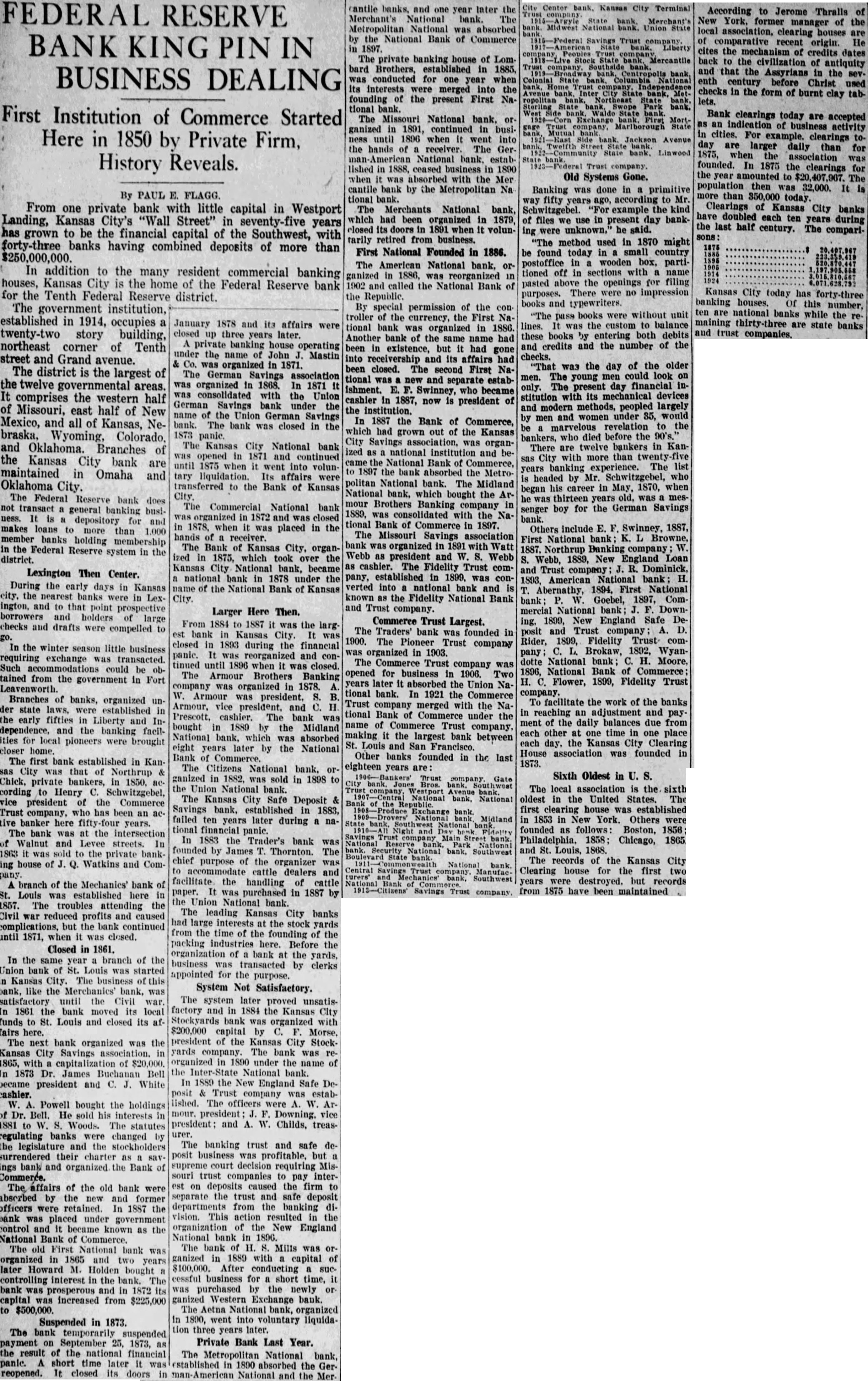 cantile banks. and one year later the FEDERAL RESERVE Merchant's National bank. The Metropolitan National was absorbed by the National Bank of Commerce BANK KING PIN IN in 1897. The private banking house of Lombard Brothers, established in 1885, BUSINESS DEALING was conducted for one year when its interests were merged into the tional bank. First Institution of Commerce Started The Missouri National bank. organized in 1891, continued in busiHere in 1850 by Private Firm, ness until 1896 when it went into the hands of a receiver. The German- American National bank, estabHistory Reveals. lished in 1888, ceased business in 1890 By PAUL E. FLAGG. tional bank. From one private bank with little capital in Westport The Merchants National bank, Landing, Kansas City's "Wall Street" in seventy-five years which had been organized in 1879, closed its doors in 1891 when it volunhas grown to be the financial capital of the Southwest, with tarily retired from business. forty-three banks having combined deposits of more than First National Founded in 1886. $250,000,000. The American National bank, or In addition to the many resident commercial banking ganized in 1886, was reorganized in houses, Kansas City is the home of the Federal Reserve bank 1902 and called the National Bank of for the Tenth Federal Reserve district. the Republic. The government institution, By special permission of the con- established in 1914, occupies a twenty-two story building, northeast corner of Tenth street and Grand avenue. The district is the largest of the twelve governmental areas. It comprises the western half of Missouri, east half of New Mexico, and all of Kansas, Nebraska. Wyoming, Colorado. and Oklahoma. Branches of the Kansas City bank are maintained in Omaha and Oklahoma City. The Federal Reserve bank does not transact a general banking business. It is a depository for and makes loans to more than 1.000 member banks holding membership in the Federal Reserve system in the district. Lexington Then Center. During the early days in Kansas city, the nearest banks were in Lexington, and to that point prospective borrowers and holders of large checks and drafts were compelled to go. In the winter season little business requiring exchange was transacted. Such accommodations could be obtained from the government in Fort Leavenworth. Branches of banks, organized under state laws, were established in the early fifties in Liberty and Independence, and the banking facilities for local pioneers were brought closer home. The first bank established in Kansas City was that of Northrup & Chick, private bankers, in 1850. according to Henry C. Schwitzgebel, vice president of the Commerce Trust company, who has been an active banker here fifty-four years. The bank was at the intersection of Walnut and Levee streets. In 1863 it was sold to the private banking house of J. Q. Watkins and Company. A branch of the Mechanics' bank of St. Louis was established here in 1857. The troubles attending the Civil war reduced profits and caused complications, but the bank continued until 1871, when it was closed. Closed in 1861. In the same year a branch of the Union bank of St. Louis was started in Kansas City. The business of this bank, like the Merchanics' bank, was satisfactory until the Civil war. In 1861 the bank moved its local funds to St. Louis and closed its affairs here. The next bank organized was the Kansas City Savings association. in 1865, with capitalization of $20,000. In 1873 Dr. James Buchanan Bell became president and C. J. White cashier. W. A. Powell bought the holdings of Dr. Bell. He sold his interests in 1881 to W. S. Woods. The statutes regulating banks were changed by the legislature and the stockholders surrendered their charter as a savings bank and organized the Bank of Commerce. The affairs of the old bank were abscrbed by the new and former officers were retained. In 1887 the bank was placed under government control and it became known as the National Bank of Commerce. The old First National bank was organized in 1865 and two years later Howard M. Holden bought a controlling interest in the bank. The bank was prosperous and in 1872 its capital was increased from $225,000 to $500,000. Suspended in 1873. The bank temporarily suspended payment on September 25. 1873, as the result of the national financial panic. A short time later it was reopened. It closed its doors January 1878 and its affairs were closed up three years later. A private banking house operating under the name of John J. Mastin & Co. was organized in 1871. The German Savings association was organized in 1868. In 1871 it was consolidated with the Union German Savings bank under the name of the Union German Savings bank. The bank was closed in the 1873 The Kansas City National bank was opened in 1871 and continued until 1875 when it went into voluntary liquidation. Its affairs were transferred to the Bank of Kansas The Commercial National bank was organized in 1872 and was closed in 1878, when it was placed in the hands of a receiver. The Bank of Kansas City, organized in 1875, which took over the Kansas City National bank, became a national bank in 1878 under the name of the National Bank of Kansas City. Larger Here Then. From 1884 to 1887 it was the largest bank in Kansas City. It was closed in 1893 during the financial panic. It was reorganized and continued until 1896 when it was closed. The Armour Brothers Banking company was organized in 1878. A. W. Armour was president, S. B. Armour, vice president, and C. H. Prescott, cashier. The bank was bought in 1889 by the Midland National bank, which was absorbed eight years later by the National Bank of Commerce. The Citizens National bank. organized in 1882. was sold in 1898 to the Union National bank. The Kansas City Safe Deposit & Savings bank, established in 1883, failed ten years later during a national financial panic. In 1883 the Trader's bank was founded by James T. Thornton. The chief purpose of the o