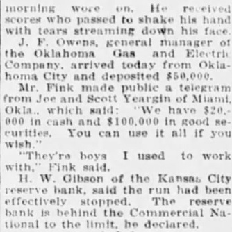 morning wore on. He scores who passed to shake his hand tears streaming down his face Owens, general manager of the klahoma Gas and Electric Company. today from homa City and deposited Mr. Fink made public telegram from and Scott Yeargin of said: We have 000 in and in good se curities. You can use it all if boys I used to work H. Gibson of the Kansas City reserve bank, said the run had been effectively stopped. The reserve bank behind the Commercial Na. tional to the limit. he declared.