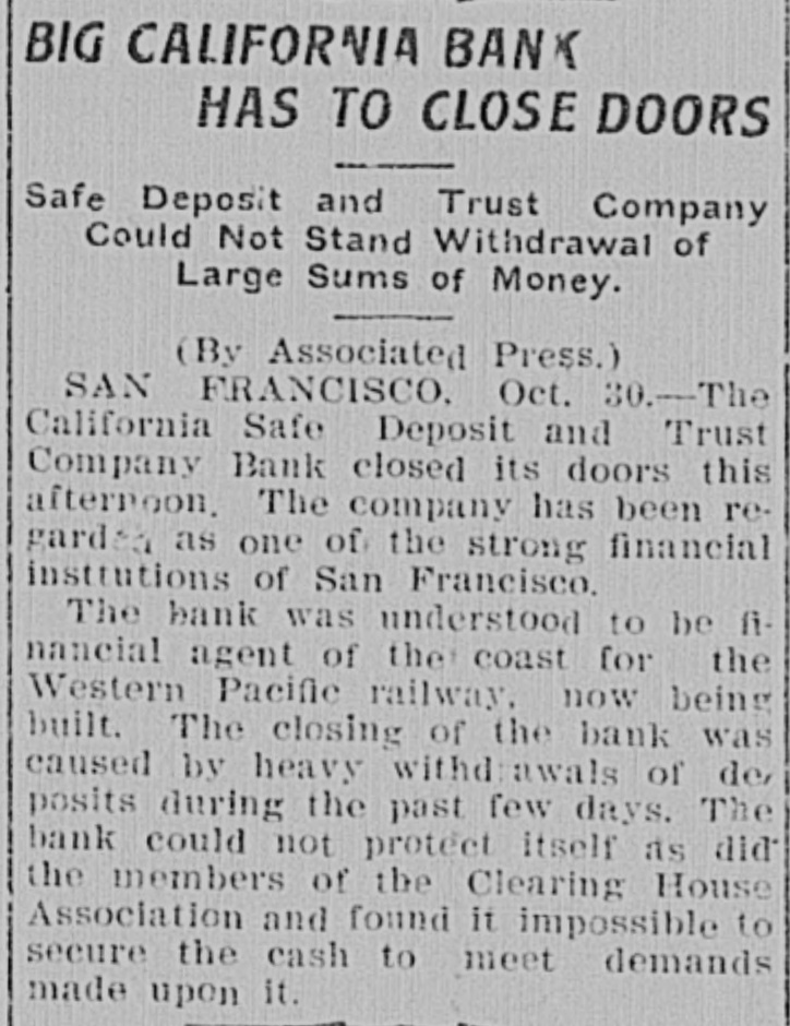 BIG CALIFORNIA BANK HAS TO CLOSE DOORS Safe Deposit and Trust Company Could Not Stand Withdrawal of Large Sums of Money. (By Associated Press.) SAN FRANCISCO. Oct. 30.-The California Safe Deposit and Trust Company Bank closed its doors this afternoon. The company has been regarden as one of the strong financial insttutions of San Francisco. The bank was understood to be financial agent of the coast for the Western Pacific railway. now being built. The closing of the bank was caused by heavy withdrawals of de, posits during the past few days. The bank could not protect itself as did the members of the Clearing House Association and found it impossible to secure the cash to meet demands made upon it.