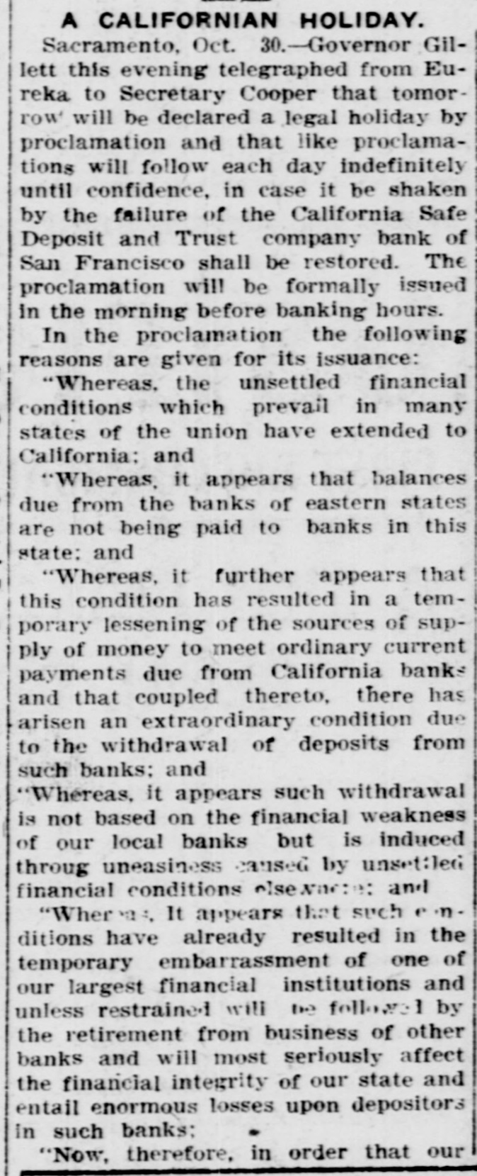 A CALIFORNIAN HOLIDAY. Sacramento, Oct. 30.-Governor Gillett this evening telegraphed from Eureka to Secretary Cooper that tomorrow will be declared a legal holiday by proclamation and that like proclamations will follow each day indefinitely until confidence, in case it be shaken by the failure of the California Safe Deposit and Trust company bank of San Francisco shall be restored. The proclamation will be formally issued in the morning before banking hours. In the proclamation the following reasons are given for its issuance: "Whereas, the unsettled financial conditions which prevail in many states of the union have extended to California: and "Whereas, it appears that balances due from the banks of eastern states are not being paid to banks in this state: and "Whereas, it further appears that this condition has resulted in a temporary lessening of the sources of supply of money to meet ordinary current payments due from California banks and that coupled thereto, there has arisen an extraordinary condition due to the withdrawal of deposits from such banks: and Whereas, it appears such withdrawal is not based on the financial weakness of our local banks but is induced through uneasiness caused by unsetileri financial conditions elsexacter and "Whereas, It appears that such e.n. ditions have already resulted in the temporary embarrassment of one of our largest financial institutions and unless restrained will the followed by the retirement from business of other banks and will most seriously affect the financial integrity of our state and entail enormous losses upon depositors in such banks: "Now, therefore, in order that our