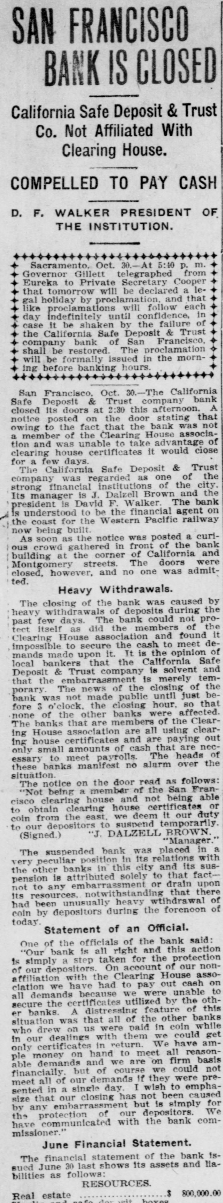 SAN FRANCISCO BANK IS CLOSED California Safe Deposit & Trust Co. Not Affiliated With Clearing House. COMPELLED TO PAY CASH D. F. WALKER PRESIDENT OF THE INSTITUTION. Sacramento. Oct. 30.-At 5:40 p. m. Governor Gillett telegraphed from Eureka to Private Secretary Cooper that tomorrow will be declared a legal holiday by proelamation, and that like proclamations will follow each day indefinitely until confidence, in case It be shaken by the failure of the California Safe Deposit & Trust company bank of San Francisco, shall be restored. The proclamation will be formally issued in the morning before banking hours. San Francisco, Oct. 30.-The California Safe Deposit & Trust company bank closed its doors at 2:30 this afternoon. A notice posted on the door stating that owing to the fact that the bank was not a member of the Clearing House association and was unable to take advantage of clearing house certificates it would close for a few days. The California Safe Deposit & Trust company was regarded as one of the strong financial institutions of the city. Its manager is J. Dalzell Brown and the president is David F. Walker. The bank is understood to be the financial agent on the coast for the Western Pacific railway now being built. As soon as the notice was posted a curious crowd gathered in front of the bank building at the corner of California and Montgomery streets. The doors were closed, however, and no one was admitted. Heavy Withdrawals. The closing of the bank was caused by heavy withdrawals of deposits during the past few days. The bank could not protect itself as did the members of the Clearing House association and found it impossible to secure the cash to meet demands made upon it. It is the opinion of local bankers that the California Safe Deposit & Trust company is solvent and that the embarrassment is merely temporary The news of the closing of the bank was not made public until just before 3 o'clock. the closing hour, SO that none of the other banks were affected. The banks that are members of the Clearing House association are all using clearing house certificates and are paying out only small amounts of cash that are necessary to meet payrolls. The heads of these banks manifest no alarm over the situation. The notice on the door read as follows: "Not being a member of the San Francisco clearing house and not being able to obtain clearing house certificates or coin from the east, we deem It our duty to our depositors to suspend temporarily. "J. DALZELL BROWN. (Signed.) "Manager." The suspended bank was placed in a very peculiar position In Its relations with the other banks in this city and its suspension is attributed solely to that factnot to any embarrassment or drain upon Its resources. notwithstanding that there had been unusually heavy wtihdrawal of coin by depositors during the forenoon of today. Statement of an Official. One of the officials of the bank said: "Our bank is all right and this action is simply a step taken for the protection of our depositors. On account of our nonaffiliation with the Clearing House assoclation we have had to pay out cash on all demands because we were unable to secure the certificates utilized by the other banks. A distressing feature of this situation was that all of the other banks who drew on us were paid in coin while in our dealings with them we could get only certificates in return. We have ample money on hand to meet all reasonable demands and we are on firm basis financially. but of course we could not meet all of our demands If they were presented in a single day. I wish to emphasize that our closing has not been caused by any embarrassment but is simply for the protection of our depositors. We have communicated with the bank commissioner." June Financial Statement. The financial statement of the bank issued June 30 last shows Its assets and liabilities as follows: RESOURCES. $ 800,000.00 Real estate hores