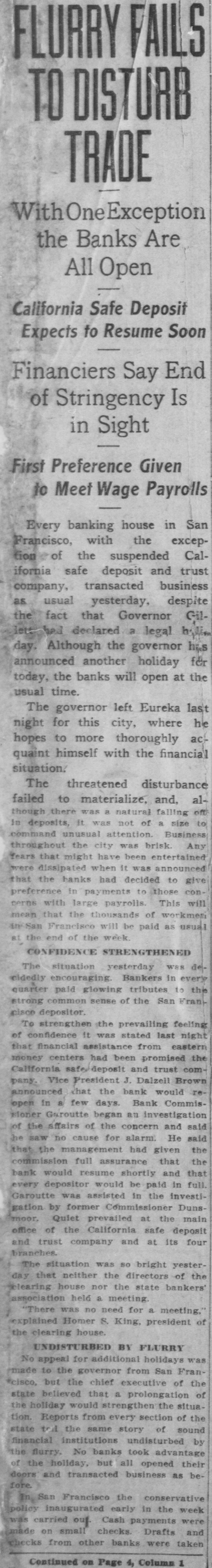 FLURRY FAILS TO DISTURB TRADE WithOneException the Banks Are All Open California Safe Deposit Expects fo Resume Soon Financiers Say End of Stringency Is in Sight First Preference Given to Meet Wage Payrolls Every banking house in San Francisco, with the exception e of the suspended California safe deposit and trust company, transacted business as usual yesterday, despite the fact that Governor Cillettahed declared a legal billin day. Although the governor his announced another holiday for today, the banks will open at the usual time. The governor left Eureka last to more acnight hopes for this city, thoroughly where he quaint himself with the financial situation. The threatened disturbance failed to materialize, and, although there was a natural falling off in deposits, it was not of a size to command unusual attention. Business throughout the city was brisk Any Years that might have been entertained were dissipated when it was announced that the banks had decided to give preference in payments to those con cerns with large payrolls This will mean that the thousands of workmen in San Francisco will be paid as usual at the end of the week CONFIDENCE STRENGTHENED The situation yesterday was del cidedly encouraging Bankers in every quarter paid glowing tributes to the strong common sense of the San Francisco depositor. To strengthen the prevailing feeling of confidence it was stated last night that financial assistance from eastern money centers had been promised the California safe/deposit and trust company. Vice President J. Dalzell Brown announced chat the bank would re. open in a few days. Bank Commisrioner Garoutte began an investigation of the affairs of the concern and said he saw no cause for alarm. He said that the management had given the commission full assurance that the bank would resume shortly and that every depositor would be paid in full. Garoutte was assisted in the investigation by former Commissioner Duns moor. Quiet prevailed at the main office of the California safe deposit and trust company and at its four branches. The situation was so bright yesterday that neither the directors of the clearing house nor the state bankers' association held a meeting "There was no need for a meeting, explained Homer S. King, president of the clearing house UNDISTURBED BY FLURRY No appeal for additional holidays was made to the governor from San Fran*cisco, but the chief executive of the state believed that a prolongation of the holiday would strengthen the situation. Reports from every section of the state tril the same story of sound financial institutions undisturbed by the flurry. No banks took advantage of the holiday, but all opened their doors and transacted business as be. fore In San Francisco the conservative policy inaugurated early in the week was carried out Cash payments were made on small checks. Drafts and checks from other banks were taken Continued on Page 4, Column 1