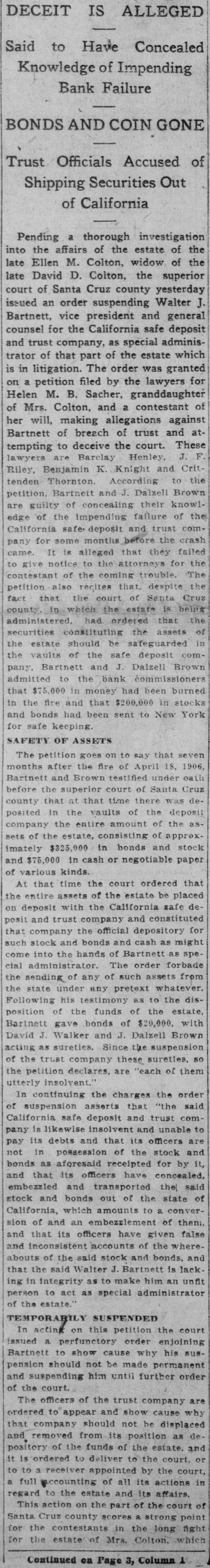 BONDS AND COIN GONE Trust Officials Accused of Shipping Securities Out of California Pending a thorough investigation into the affairs of the estate of the late Ellen M. Colton, widow of the late David D. Colton, the superior court of Santa Cruz county yesterday issued an order suspending Walter J. Bartnett, vice president and general counsel for the California safe deposit and trust company, as special administrator of that part of the estate which is in litigation. The order was granted on a petition filed by the lawyers for Helen M. B. Sacher, granddaughter of Mrs. Colton, and a contestant of her will, making allegations against Bartnett of breach of trust and attempting to deceive the court. These lawyers are Barclay Henley, J. F. Riley, Benjamin K. Knight and Crittenden Thornton. According to the petition, Bartnett and J. Dalzell Brown are guilty of concealing their knowledge of the impending failure of the California safe. deposit and trust company for some months before the crash came. It is alleged that they failed to give notice to the attorneys for the contestant of the coming trouble. The petition also recites that, despite the fact that the court of Santa Cruz county in which the estate is being administered, had ordered that the securities constituting the assets of the estate should be safeguarded in the vaults of the safe deposit company, Bartnett and J. Dalzell Brown admitted to the bank commissioners that $75,000 in money had been burned in the fire and that $200,000 in stocks and bonds had been sent to New York for safe keeping. SAFETY OF ASSETS : The petition goes on to say that seven after the fire of 1906, and Brown testified oath Bartnett months before April under 18, the superior court of Santa Cruz at that time there was deposited county that in the vaults of the deposit company the entire amount of sets the estate, consisting of of approx- the asimately $325,000 in bonds and stock and $75,000 in cash or negotiable paper of various kinds. At that time the court ordered that the entire assets of the estate be placed on deposit with the California safe deposit and trust company and constituted that company the official depository for such stock and bonds and cash as might come into the hands of Bartnett as special administrator. The order forbade of any of such assets from state under any whatever. the the sending pretext Following his as to disof the funds of the position Bartnett testimony the estate, gave bonds of $20,000. with David J. Walker and J. Dalzell Brown acting as sureties. Since the suspension company so petition declares, are "each the of the trust these sureties, of them utterly insolvent." In continuing the charges the order of suspension asserts that "the said California safe deposit and insolvent and pany pay its is likewise trust unable com- to debts and that its officers are not in possession of the stock and bonds as aforesaid receipted for by it, its officers have and transported said stock and embezzled that and concealed, the bonds out of the which amounts to a sion California, of state conver- of and an embezzlement of them, its officers have accounts of and and abouts inconsistent that given the where- false of the said stock and bonds, and said Walter J. Bartnett lack. that ing in the is integrity as to make him an unfit person to act as special administrator of the estate." TEMPORARILY SUSPENDED In acting on this petition the court issued a perfunctory order enjoining to show cause pension Bartnett why his susshould not be made permanent and suspending him until further order of the court. The officers of the trust company appear and show ordered that to cause why are company should not be displaced and removed from its position as depository of the funds of the estate, and it is ordered to deliver to the or 3. receiver appointed by to a full to the court, court. accounting of all its actions in regard to the estate and its on the part of the Santa I This Cruz action affairs. court of county scores a strong point for the contestants in the long fight for the estate of Mrs. Colton. which Continued on Page 3. Column