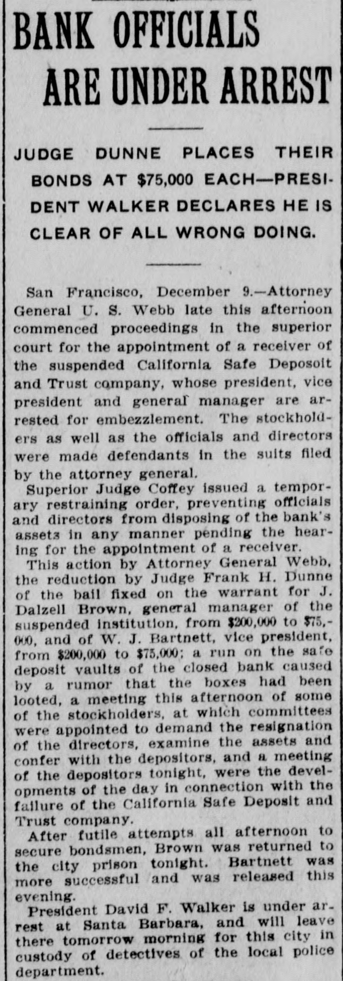 BANK OFFICIALS ARE UNDER ARREST JUDGE DUNNE PLACES THEIR BONDS AT $75,000 EACH-PRESIDENT WALKER DECLARES HE IS CLEAR OF ALL WRONG DOING. San Francisco, December 9.-Attorney General U. S. Webb late this afternoon commenced proceedings in the superior court for the appointment of a receiver of the suspended California Safe Deposoit and Trust company, whose president, vice president and general manager are arrested for embezzlement. The stockholders as well as the officials and directors were made defendants in the suits filed by the attorney general. Superior Judge Coffey issued a temporary restraining order, preventing officials and directors from disposing of the bank's assets in any manner pending the hearing for the appointment of a receiver. This action by Attorney General Webb, the reduction by Judge Frank H. Dunne of the bail fixed on the warrant for J. Dalzell Brown, general manager of the suspended institution, from $200,000 to $75.000, and of W. J. Bartnett, vice president, from $200,000 to $75,000; a run on the safe deposit vaults of the closed bank caused by a rumor that the boxes had been looted, a meeting this afternoon of some of the stockholders, at which committees were appointed to demand the resignation of the directors, examine the assets and confer with the depositors, and a meeting of the depositors tonight, were the developments of the day in connection with the failure of the California Safe Deposit and Trust company. After futile attempts all afternoon to secure bondsmen, Brown was returned to the city prison tonight. Bartnett was more successful and was released this evening. President David F. Walker is under arrest at Santa Barbara, and will leave there tomorrow morning for this city in custody of detectives of the local police department.