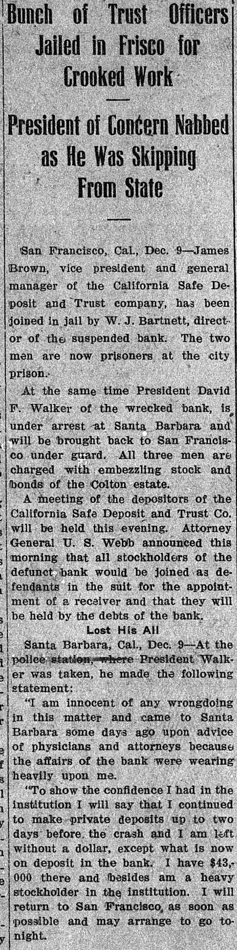Bunch of Trust Officers Jailed in Frisco for Crooked Work President of Concern Nabbed as He Was Skipping From State San Francisco, Cal., Dec. 9-James Brown, vice president and general manager of the California Safe Deposit and Trust company, has been joined in jail by W. J. Bartnett, director of the suspended bank. The two men are now prisoners at the city prison. At the same time President David F. Walker of the wrecked bank, is under arrest at Santa Barbara and will be brought back to San FrancisCO under guard. All three men are charged with embezzling stock and bonds of the Colton estate. A meeting of the depositors of the California Safe Deposit and Trust Co. will be held this evening. Attorney General U. S. Webb announced this morning that all stockholders of the defunct bank would be joined as defendants in the suit for the appointment of a receiver and that they will be held by the debts of the bank. Lost His All Santa Barbara, Cal., Dec. 9--At the police station, where President Walker was taken, he made the following statement: "I am innocent of any wrongdoing in this matter and came to Santa Barbara some days ago upon advice of physicians and attorneys because the affairs of the bank were wearing heavily upon me. "To show the confidence I had in the institution I will say that I continued to make private deposits up to two days before. the crash and I am left without a dollar, except what is now on deposit in the bank. I have $43,000 there and besides am a heavy stockholder in the institution. I will return to San Francisco, as soon as possible and may arrange to go tonight.