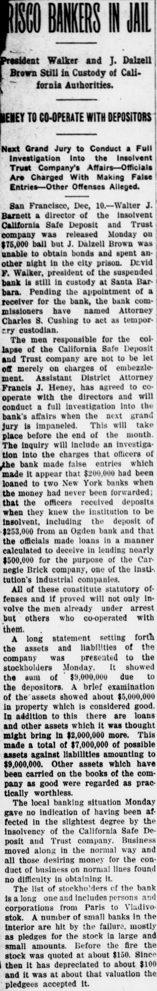 RISCO BANKERS IN JAIL President Walker and J. Dalzell Brown Still in Custody of California Authorities. MENEY TO CO-OPERATE WITH DEPOSITORS Next Grand Jury to Conduct a Full Investigation Into the Insolvent Trust Company's Affairs-Officials Are Charged With Making False Entries-Other Offenses Alleged. San Francisce, Dec, 10.-Walter J. Barnett a director of the insolvent California Safe Deposit and Trust company was released Monday on $75,000 bail but J. Dalzell Brown was unable to obtain bonds and spent another night in the city prison. David F. Walker, president of the suspended bank is still in custody at Santa Barbara. Pending the appointment of a receiver for the bank, the bank commissioners have named Attorney Charles S. Cushing to act as temporary custodian. The men responsible for the collapse of the California Safe Deposit and Trust company are not to be let off merely on charges of embezzlement. Assistant District Attorney Francis J. Heney, has agreed to cooperate with the directors and will conduct a full investigation into the bank's affairs when the next grand jury is impaneled. This will take place before the end of the month. The inquiry will include an investigation into the charges that officers of the bank made false entries which made it appear that $200,000 had been loaned to two New York banks when the money had never been forwarded; that the officers received deposits when they knew the institution to be insolvent, including the deposit of $253,000 from an Ogden bank and that the officials made loans in a manner calculated to deceive in lending nearly $500,000 for the purpose of the Carnegie Brick company, one of the institution's industrial companies. All of these constitute statutory offenses and if proved will not only involve the men already under arrest but others who co-operated with them. A long statement setting forth the assets and liabilities of the company was presented to the stockholders Monday. It showed the sum of $9,000,000 due to the depositors. A brief examination of the assets showed about $5,000,000 in property which is considered good. In addition to this there are loans and other assets which it was thought might bring in $2,000,000 more. This made a total of $7,000,000 of possible assets against liabilities amounting to $9,000,000. Other assets which have been carried on the books of the company as good were regarded as practically worthless. The local banking situation Monday gave no indication of having been affected in the slightest degree by the insolvency of the California Safe Deposit and Trust company. Business moved along in the normal way and all those desiring money for the conduct of business on normal lines found no difficulty in obtaining it. The list of stockholders of the bank is a long one and includes persons and corporations from Paris to Vladivostok. A number of small banks in the interior are hit by the failure, mostly as pledges for the stock in large and small amounts. Before the fire the stock was quoted at about $150. Since