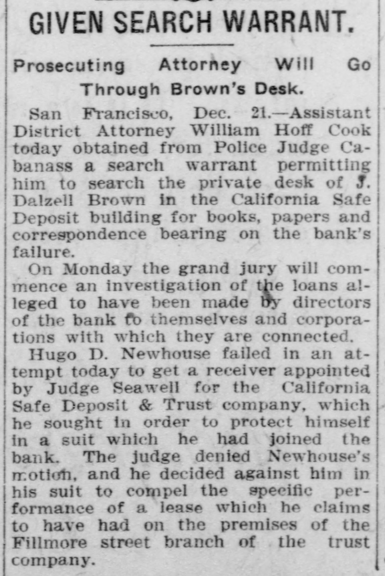 GIVEN SEARCH WARRANT. Prosecuting Attorney Will Go Through Brown's Desk. San Francisco, Dec. 21.-Assistant District Attorney William Hoff Cook today obtained from Police Judge Cabanass a search warrant permitting him to search the private desk of 3. Dalzell Brown in the California Safe Deposit building for books, papers and correspondence bearing on the bank's failure. On Monday the grand jury will commence an investigation of the loans alleged to have been made by directors of the bank to themselves and corporations with which they are connected. Hugo D. Newhouse failed in an attempt today to get a receiver appointed by Judge Seawell for the California Safe Deposit & Trust company, which he sought in order to protect himself in a suit which he had joined the bank. The judge denied Newhouse's motion, and he decided against him in his suit to compel the specific performance of a lease which he claims to have had on the premises of the Fillmore street branch of the trust company.