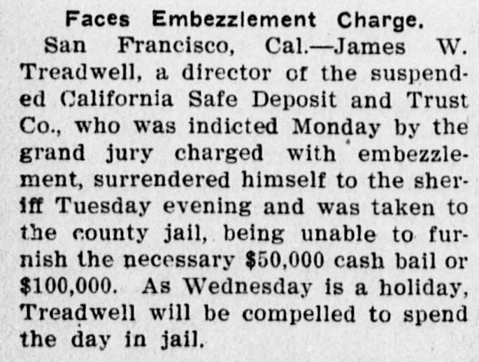 San Francisco, Cal.-James W. Treadwell, a director of the suspend-ed California Safe Deposit and Trust Co., who was indicted Monday by the grand jury charged with embezzlement, surrendered himself to the sheriff Tuesday evening and was taken to the county jail, being unable to furnish the necessary $50,000 cash bail or $100,000. As Wednesday is a holiday, Treadwell will be compelled to spend the day in jail.