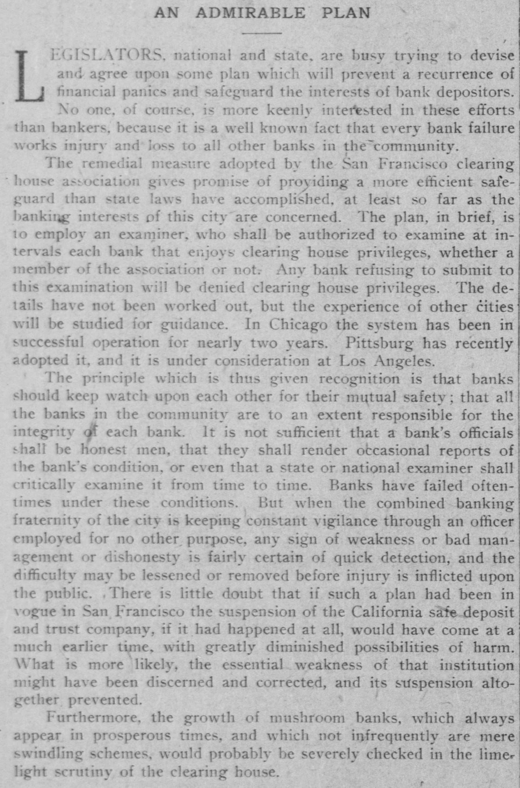 AN ADMIRABLE PLAN EGISLATORS, national and state, are busy trying to devise and agree upon some plan which will prevent a recurrence of financial panics and safeguard the interests of bank depositors. L No one, of course, is more keenly interested in these efforts than bankers, because it is a well known fact that every bank failure works injury and loss to all other banks in the community. The remedial measure adopted by the San Francisco clearing house association gives promise of providing a more efficient safeguard than state laws have accomplished, at least SO far as the banking interests of this city are concerned. The plan, in brief, is to employ an examiner, who shall be authorized to examine at intervals each bank that enjoys clearing house privileges, whether a member of the association or not. Any bank refusing to submit to this examination will be denied clearing house privileges. The details have not been worked out, but the experience of other cities will be studied for guidance. In Chicago the system has been in successful operation for nearly two years. Pittsburg has recently adopted it, and it is under consideration at Los Angeles. The principle which is thus given recognition is that banks should keep watch upon each other for their mutual safety; that all the banks in the community are to an extent responsible for the integrity of each bank. It is not sufficient that a bank's officials shall be honest men, that they shall render occasional reports of the bank's condition, or even that a state or national examiner shall critically examine it from time to time. Banks have failed oftentimes under these conditions. But when the combined banking fraternity of the city is keeping constant vigilance through an officer employed for no other purpose, any sign of weakness or bad management or dishonesty is fairly certain of quick detection, and the difficulty may be lessened or removed before injury is inflicted upon the public. There is little doubt that if such a plan had been in vogue in San Francisco the suspension of the California safe deposit and trust company, if it had happened at all, would have come at a much earlier time, with greatly diminished possibilities of harm. What is more likely, the essential weakness of that institution might have been discerned and corrected, and its suspension altogether prevented. Furthermore, the growth of mushroom banks, which always appear in prosperous times, and which not infrequently are mere swindling schemes, would probably be severely checked in the limer light scrutiny of the clearing house.