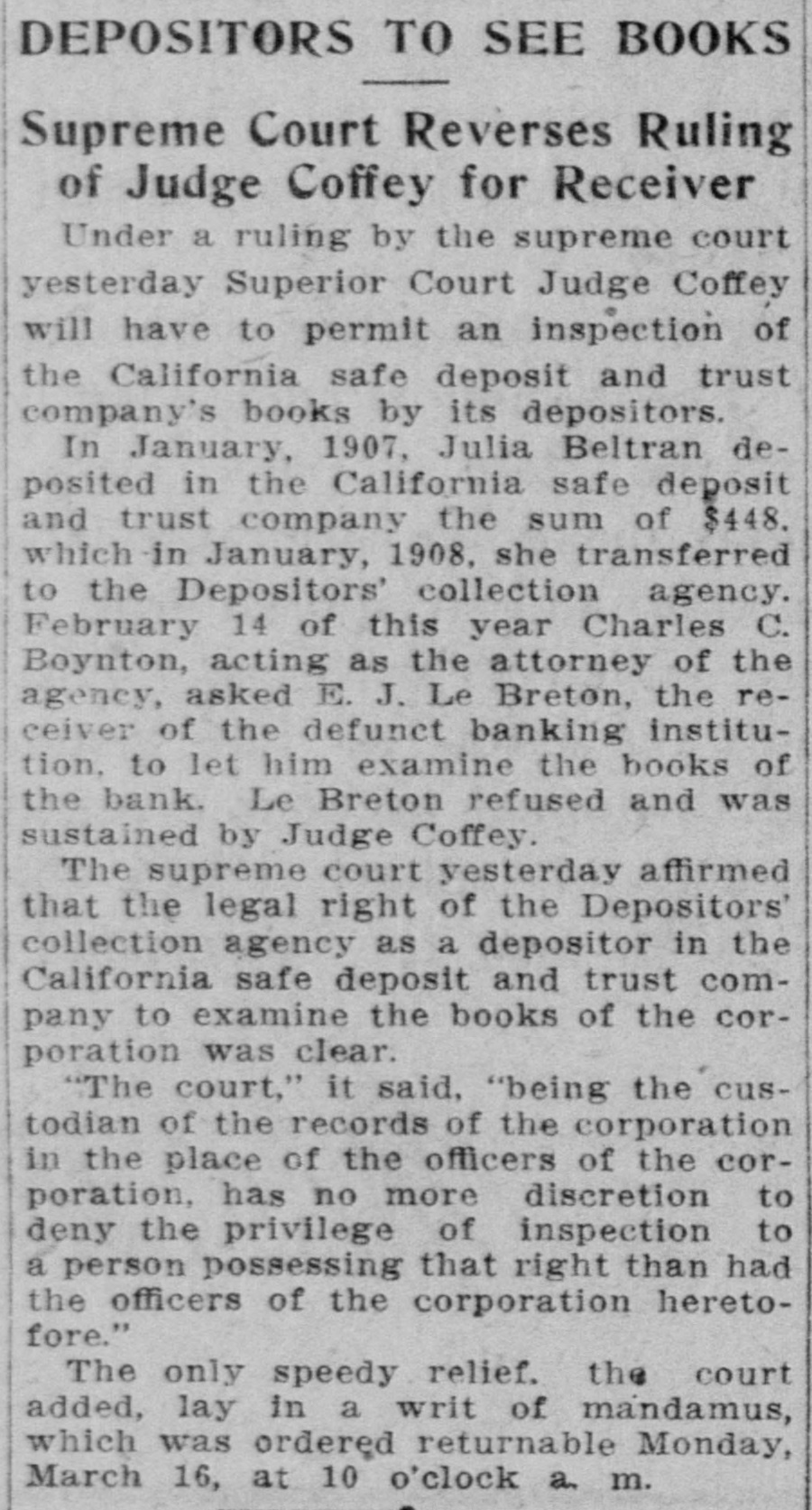 DEPOSITORS TO SEE BOOKS Supreme Court Reverses Ruling of Judge Coffey for Receiver Under a ruling by the supreme court yesterday Superior Court Judge Coffey will have to permit an inspection of the California safe deposit and trust company's books by its depositors. In January, 1907, Julia Beltran deposited in the California safe deposit and trust company the sum of $448. which in January, 1908, she transferred to the Depositors' collection agency. February 14 of this year Charles C. Boynton, acting as the attorney of the agency, asked E. J. Le Breton, the receiver of the defunct banking institution. to let him examine the books of the bank. Le Breton refused and was sustained by Judge Coffey. The supreme court yesterday affirmed that the legal right of the Depositors' collection agency as a depositor in the California safe deposit and trust company to examine the books of the corporation was clear. "The court," it said, "being the custodian of the records of the corporation in the place of the officers of the corporation, has no more discretion to deny the privilege of inspection to a person possessing that right than had the officers of the corporation heretofore." The only speedy relief. the court added, lay in a writ of mandamus, which was ordered returnable Monday, March 16, at 10 o'clock a. m.