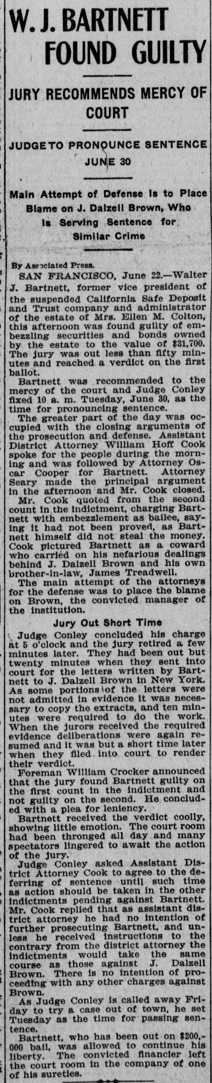 W. J. BARTNETT FOUND GUILTY JURY RECOMMENDS MERCY OF COURT JUDGE TO PRONOUNCE SENTENCE JUNE 30 Main Attempt of Defense Is to Place Blame on J. Dalzell Brown, Who Is Serving Sentence for Similar Crime By Associated Press. SAN FRANCISCO, June 22.-Walter J. Bartnett, former vice president of the suspended California Safe Deposit and Trust company and administrator of the estate of Mrs. Ellen M. Colton, this afternoon was found guilty of embezzling securities and bonds owned by the estate to the value of $31,700. The jury was out less than fifty minutes and reached a verdict on the first ballot. Bartnett was recommended to the mercy of the court and Judge Conley fixed 10 a. m. Tuesday, June 30, as the time for pronouncing sentence. The greater part of the day was occupied with the closing arguments of the prosecution and defense. Assistant District Attorney William Hoff Cook spoke for the people during the morning and was followed by Attorney Oscar Cooper for Bartnett. Attorney Seary made the principal argument in the afternoon and Mr. Cook closed. Mr. Cook quoted from the second count in the indictment, charging Bartnett with embezzlement as bailee, saying it had not been proved, as Bartnett himself did not steal the money. Cook pictured Bartnett as a coward who carried on his nefarious dealings behind J. Dalzell Brown and his own brother-in-law, James Treadwell. The main attempt of the attorneys for the defense was to place the blame on Brown, the convicted manager of the institution. Jury Out Short Time Judge Conley concluded his charge at 5 o'clock and the jury retired a few minutes later. They had been out but twenty minutes when they sent into court for the letters written by Bartnett to J. Dalzell Brown in New York. As some portions lof the letters were not admitted in evidence it was necessary to copy the extracts, and ten minutes were required to do the work. When the jurors received the required evidence deliberations were again resumed and it was but a short time later when they filed into court to render their verdict. Foreman William Crocker announced that the jury found Bartnett guilty on the first count in the indictment and not guilty on the second. He concluded with a plea for leniency. Bartnett received the verdict coolly, showing little emotion. The court room had been thronged all day and many spectators lingered to await the action of the jury. Judge Conley asked Assistant District Attorney Cook to agree to the deferring of sentence until such time as action should be taken in the other indictments pending against Bartnett. Mr. Cook replied that as assistant district attorney he had no intention of further prosecuting Bartnett, and unless he received instructions to the contrary from the district attorney the indictments would take the same course as those against J. Dalzell Brown. There is no intention of proceeding with any other charges against Brown. As Judge Conley is called away Friday to try a case out of town, he set Tuesday as the time for passing sentence. Bartnett, who has been out on $200,000 bail, was allowed to continue his liberty. The convicted financier left the court room in the company of one of his sureties.