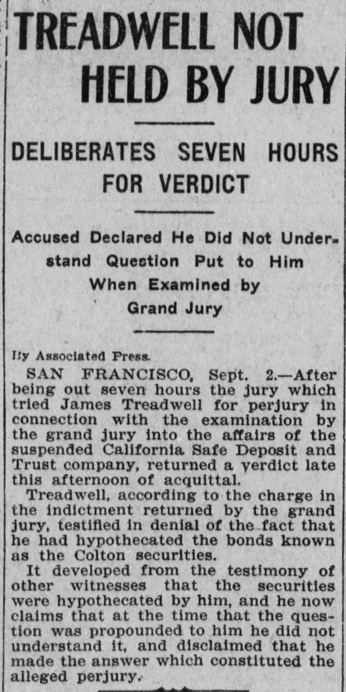 TREADWELL NOT HELD BY JURY DELIBERATES SEVEN HOURS FOR VERDICT Accused Declared He Did Not Understand Question Put to Him When Examined by Grand Jury By Associated Press. SAN FRANCISCO, Sept. 2.-After being out seven hours the jury which tried James Treadwell for perjury in connection with the examination by the grand jury into the affairs of the suspended California Safe Deposit and Trust company, returned a verdict late this afternoon of acquittal. Treadwell, according to the charge in the indictment returned by the grand jury, testified in denial of the fact that he had hypothecated the bonds known as the Colton securities. It developed from the testimony of other witnesses that the securities were hypothecated by him, and he now claims that at the time that the question was propounded to him he did not understand it, and disclaimed that he made the answer which constituted the alleged perjury.