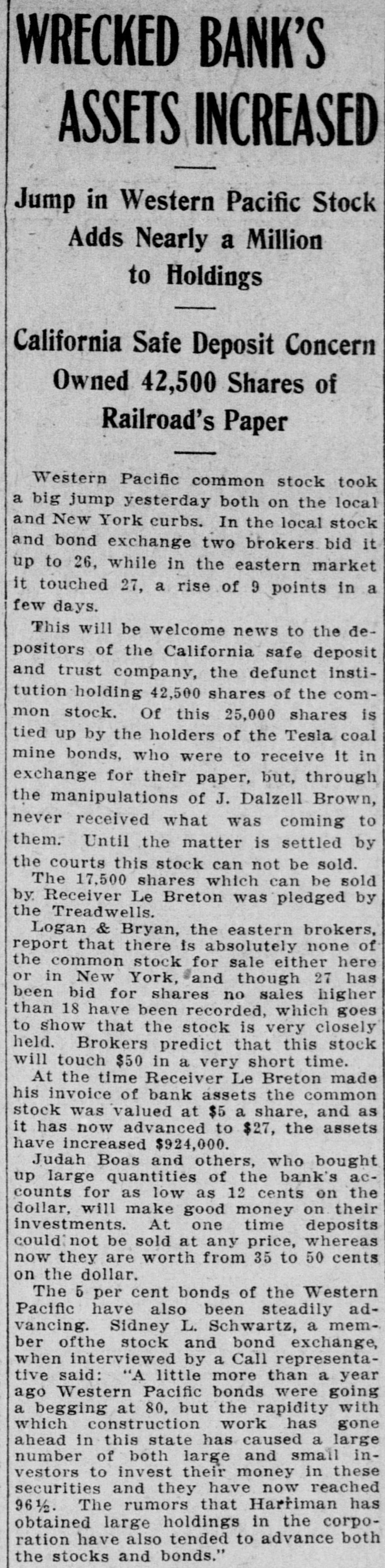 WRECKED BANK'S ASSETS INCREASED Jump in Western Pacific Stock Adds Nearly a Million to Holdings California Safe Deposit Concern Owned 42,500 Shares of Railroad's Paper Western Pacific common stock took a big jump yesterday both on the local and New York curbs. In the local stock and bond exchange two brokers bid it up to 26, while in the eastern market it touched 27, a rise of 9 points in a few days. This will be welcome news to the depositors of the California safe deposit and trust company, the defunct institution holding 42,500 shares of the common stock. Of this 25,000 shares is tied up by the holders of the Tesla coal mine bonds, who were to receive it in exchange for their paper, but, through the manipulations of J. Dalzell Brown, never received what was coming to them. Until the matter is settled by the courts this stock can not be sold. The 17,500 shares which can be sold by Receiver Le Breton was pledged by the Treadwells. Logan & Bryan, the eastern brokers, report that there is absolutely none of the common stock for sale either here or in New York, and though 27 has been shares than 18 bid have for recorded, no sales higher been which goes to show that the stock is very closely held. Brokers predict that this stock will touch $50 in a very short time. At the time Receiver Le Breton made his invoice of bank assets the common stock was valued at $5 a share, and as it has now advanced to $27, the assets have increased $924,000. Judah Boas and others, who bought up large quantities of the bank's accounts for as low as 12 cents on the dollar, will make good money on their investments. At one time deposits could not be sold at any price, whereas now they are worth from 35 to 50 cents on the dollar. The 5 per cent bonds of the Western Pacific have also been steadily advancing. Sidney L. Schwartz, a member ofthe stock and bond exchange, when interviewed by a Call representative said: "A little more than a year ago Western Pacific bonds were going a begging at 80, but the rapidity with which construction work has gone ahead in this state has caused a large number of both large and small investors to invest their money in these securities and they have now reached 961/2. The rumors that Harriman has obtained large holdings in the corporation have also tended to advance both the stocks and bonds."