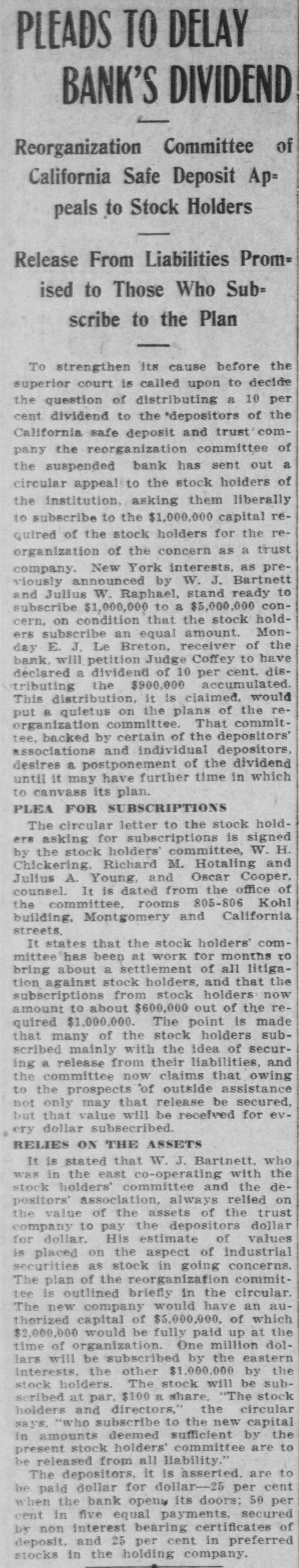 PLEADS TO DELAY BANK'S DIVIDEND Reorganization Committee of California Safe Deposit Ap= peals to Stock Holders Release From Liabilities Prom= ised to Those Who Sub= scribe to the Plan To strengthen its cause before the superior court is called upon to decide the question of distributing a 10 per cent dividend to the "depositors of the California safe deposit and trust'company the reorganization committee of the suspended bank has sent out a circular appealito the stock holders of the institution, asking them liberally to subscribe to the $1,000,000 capital required of the stock holders for the reorganization of the concern as a trust company. New York interests, as previously announced by W. J. Bartnett and Julius W. Raphael, stand ready to subscribe $1,000,000 to a $5,000,000 concern, on condition that the stock holders subscribe an equal amount. Monday E. J. Le Breton, receiver of the bank. will petition Judge Coffey to have declared a dividend of 10 per cent, distributing the $900,000 accumulated. This distribution, it is claimed, would put B. quietus on the plans of the reorganization committee. That committee, backed by certain of the depositors' associations and individual depositors, desires a postponement of the dividend until it may have further time in which to canvass its plan. PLEA FOR SUBSCRIPTIONS The circular letter to the stock holders asking for subscriptions is signed by the stock holders' committee, W. H. Chickering, Richard M. Hotaling and Julius A. Young, and Oscar Cooper, counsel. It is dated from the office of the committee, rooms 805-806 Kohl building, Montgomery and California streets. It states that the stock holders' committee has been at work for months to bring about a settlement of all litigation against stock holders, and that the subscriptions from stock holders now amount to about $600,000 out of the required $1,000,000. The point is made that many of the stock holders subscribed mainly with the idea of securing a release from their liabilities, and the committee now claims that owing to the prospects of outside assistance not only may that release be secured, but that value will be received for every dollar subsecribed. RELIES ON THE ASSETS It is stated that W. J. Bartnett, who was in the east co-operating with the stock holders' committee and the depositors' association, always relied on the value of the assets of the trust company to pay the depositors dollar for dollar. His estimate of values is placed on the aspect of industrial securities as stock in going concerns. The plan of the reorganization committee is outlined briefly in the circular. The new company would have an authorized capital of $5,000,000, of which $2,000,000 would be fully paid up at the time of organization. One million dollars will be subscribed by the eastern interests, the other $1,000,000 by the stock holders. The stock will be subscribed at par, $100 a share. "The stock holders and directors," the circular says, "who subscribe to the new capital in amounts deemed sufficient by the present stock holders' committee are to be released from all liability." The depositors, it is asserted, are to be paid dollar for dollar-25 per cent when the bank opens its doors; 50 per cent in five equal payments, secured by non interest bearing certificates of