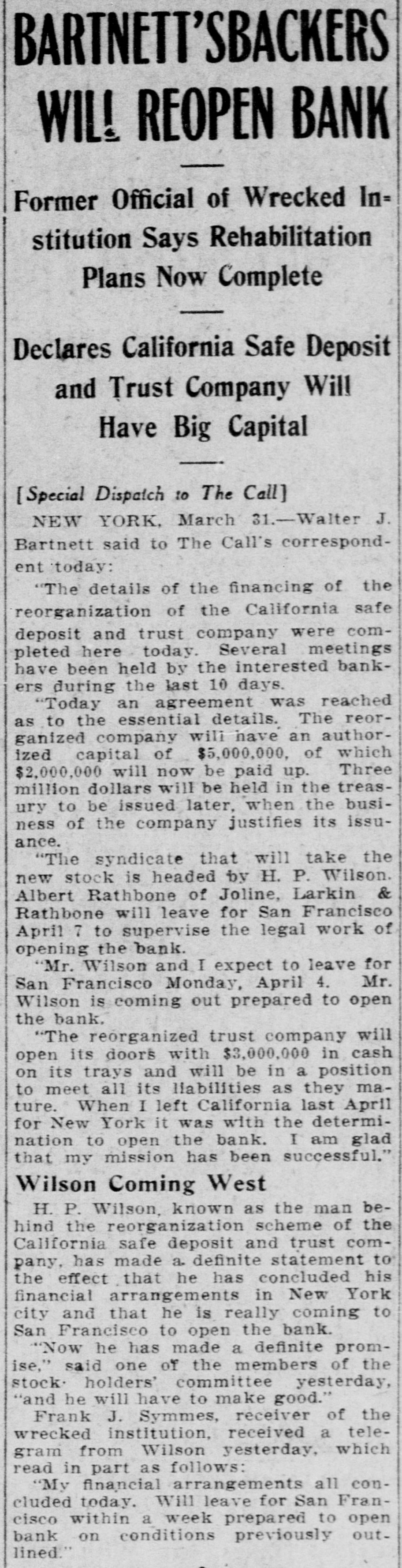 BARTNETT'SBACKERS WIL! REOPEN BANK Former Official of Wrecked In= stitution Says Rehabilitation Plans Now Complete / Declares California Safe Deposit and Trust Company Will Have Big Capital [Special Dispatch to The Call] NEW YORK, March 31.-Walter J. Bartnett said to The Call's correspondent today: "The details of the financing of the reorganization of the California safe deposit and trust company were completed here today. Several meetings have been held by the interested bankers during the last 10 days. "Today an agreement was reached as to the essential details. The reorganized company will have an authorized capital of $5,000,000, of which $2,000,000 will now be paid up. Three million dollars will be held in the treasury to be issued later. when the business of the company justifies its issuance. "The syndicate that will take the new stock is headed by H. P. Wilson. Albert Rathbone of Joline, Larkin & Rathbone will leave for San Francisco April 7 to supervise the legal work of opening the bank. "Mr. Wilson and I expect to leave for San Francisco Monday, April 4. Mr. Wilson is coming out prepared to open the bank. "The reorganized trust company will open its doors with $3,000,000 in cash on its trays and will be in a position to meet all its liabilities as they mature. When I left California last April for New York it was with the determination to open the bank. I am glad that my mission has been successful." Wilson Coming West H. P. Wilson, known as the man behind the reorganization scheme of the California safe deposit and trust company, has made a. definite statement to the effect that he has concluded his financial arrangements in New York city and that he is really coming to San Francisco to open the bank. "Now he has made a definite promise," said one of the members of the stock holders' committee yesterday, "and he will have to make good." Frank J. Symmes, receiver of the wrecked institution, received a telegram from Wilson yesterday, which read in part as follows: "My financial arrangements all concluded today. Will leave for San Francisco within a week prepared to open bank on conditions previously outlined.