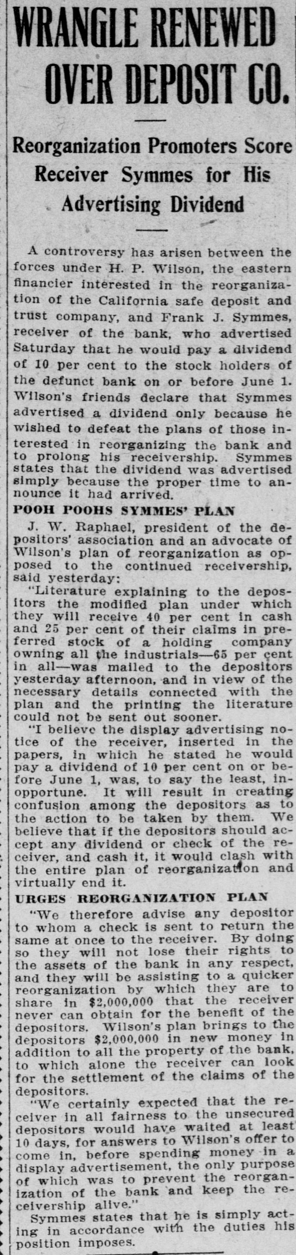 WRANGLE RENEWED OVER DEPOSIT CO. Reorganization Promoters Score Receiver Symmes for His Advertising Dividend A controversy has arisen between the forces under H. P. Wilson, the eastern financier interested in the reorganization of the California safe deposit and trust company, and Frank J. Symmes, receiver of the bank, who advertised Saturday that he would pay a dividend of 10 per cent to the stock holders of the defunct bank on or before June 1. Wilson's friends declare that Symmes advertised a dividend only because he wished to defeat the plans of those interested in reorganizing the bank and to prolong his receivership. Symmes states that the dividend was advertised simply because the proper time to announce it had arrived. POOH POOHS SYMMES' PLAN J. W. Raphael, president of the depositors' association and an advocate of Wilson's plan of reorganization as opposed to the continued receivership, said yesterday: "Literature explaining to the depositors the modified plan under which they will receive 40 per cent in cash and 25 per cent of their claims in preferred stock of a holding company owning all the industrials-65 per cent in all-was mailed to the depositors yesterday afternoon, and in view of the necessary details connected with the plan and the printing the literature could not be sent out sooner. "I believe the display advertising notice of the receiver, inserted in the papers, in which he stated he would pay a dividend of 10 per cent on or before June 1, was, to say the least, inopportune. It will result in creating confusion among the depositors as to the action to be taken by them. We believe that if the depositors should accept any dividend or check of the re: ceiver, and cash it, it would clash with the entire plan of reorganization and virtually end it. URGES REORGANIZATION PLAN "We therefore advise any depositor to whom a check is sent to return the same at once to the receiver. By doing so they will not lose their rights to the assets of the bank in any respect, and they will be assisting to a quicker reorganization by which they are to share in $2,000,000 that the receiver never can obtain for the benefit of the depositors. Wilson's plan brings to the depositors $2,000,000 in new money in addition to all the property of the bank, to which alone the receiver can look for the settlement of the claims of the depositors. "We certainly expected that the receiver in all fairness to the unsecured depositors would have waited at least 10 days, for answers to Wilson's offer to : come in, before spending money in a , ) display advertisement, the only purpose ) of which was to prevent the reorgan> ization of the bank and keep the receivership alive." ( Symmes states that he is simply act, : ing in accordance with the duties his ) position imposes.
