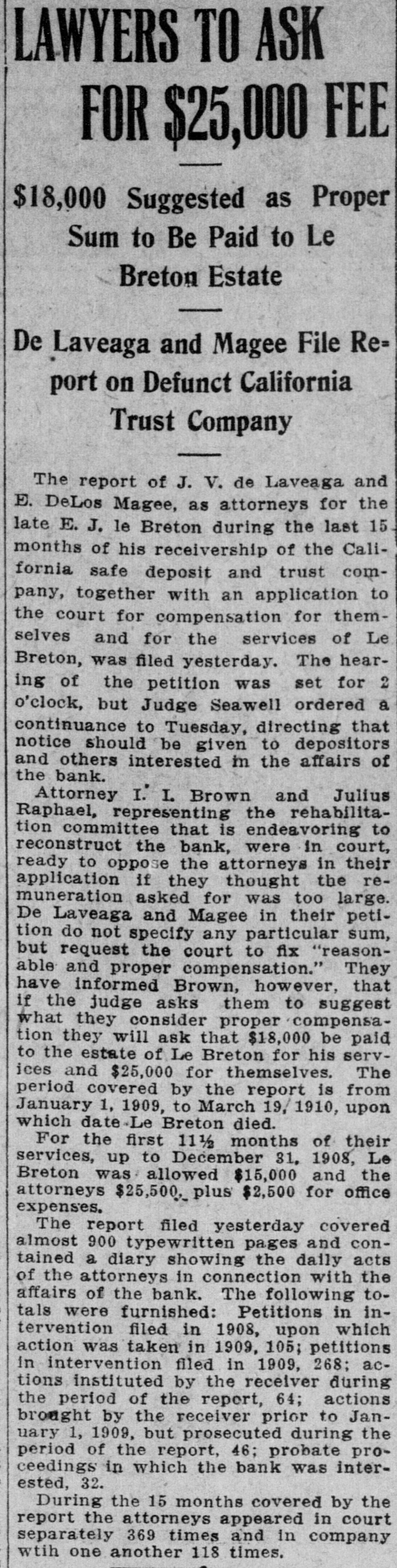 LAWYERS TO ASK FOR $25,000 FEE $18,000 Suggested as Proper Sum to Be Paid to Le Breton Estate De Laveaga and Magee File Re= port on Defunct California Trust Company The report of J. V. de Laveaga and E. DeLos Magee, as attorneys for the late E. J. le Breton during the last 15 months of his receivership of the California safe deposit and trust company, together with an application to the court for compensation for themselves and for the services of Le Breton, was filed yesterday. The hearing of the petition was set for 2 o'clock, but Judge Seawell ordered a continuance to Tuesday, directing that notice should be given to depositors and others interested in the affairs of the bank. Attorney I. I. Brown and Julius Raphael, representing the rehabilitation committee that is endeavoring to reconstruct the bank, were . in court, ready to oppose the attorneys in their application if they thought the remuneration asked for was too large. De Laveaga and Magee in their petition not the "reasonbut request do specify court any to particular fix sum, able and proper compensation." They have informed Brown, however, that asks them to consider if what the they judge proper compensa- suggest tion they will ask that $18,000 be paid to the estate of Le Breton for his services and $25,000 for themselves. The period covered by the report is from January 1, 1909, to March 19, 1910, upon which date-Le Breton died. of their services, For the first 11 1/2 months up to December 31, 1908, Le Breton was allowed $15,000 and the attorneys $25,500, plus $2,500 for office expenses. The report filed yesterday covered almost 900 cona the acts tained diary typewritten showing pages daily and of the attorneys in connection with the affairs of the bank. The following towere in tals tervention furnished: filed 1908, Petitions upon in which inaction was taken in 1909, 105; petitions in intervention filed in 1909, 268; actions instituted by the receiver during the period of the report, 64; actions brought by the receiver prior to January 1, 1909, but prosecuted during the period of the report, 46; probate proceedings in which the bank was interested, 32. During the 15 months covered by the report the attorneys appeared in court separately 369 times and in company wtih one another 118 times.