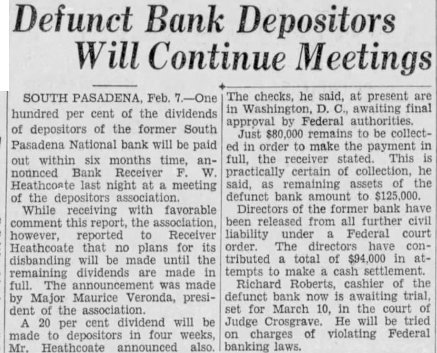 BANK ASSETS TOLD SOUTH PASADENA, April 7. Total assets of the former South Pasadena National bank now amount to $338,559.42 according to the announcement of F. W. Heathcote, federal receiver. Total liabilities amount to $417,760.73. The figures represent sums accounted for on March 31 of this year. Listed under the heading of assets, $229,764.96 are for bills receivable. $16,115.78 for other than bills receivable, $36,541.85 for stock $10,030.84 for additional assets acquired, $292,453.43 for total uncollected assets, $46,105.99 for cash on hand. Under liabilities, $386,279.56 are for total unsecured claims proved. for total unsecured claims not proved, total rediscounts unpaid, total secured claims unpaid, and total bills payable unpaid are not listed while total additional claims proved amounted to $15,Dividend paid during the last quarter, to March 31, amounted to $36,138.50. and total dividend paid to date amounted to $200,786.67 In his comments upon the condition of the former bank, Receiver Heathcote said, "I am sorry that it is not possible for me to give any indication at this time, as to when or in what an other dividend will be paid. Up to this time, there has been but one dividend of 50 per cent. and most of this already has been paid out. While the cash on hand, as shown in the statement, might indicate the posibility of another early dividend, considerable pending litigation makes it essential that a sufficient cash reserves shall be maintained to cover possible emergencies.