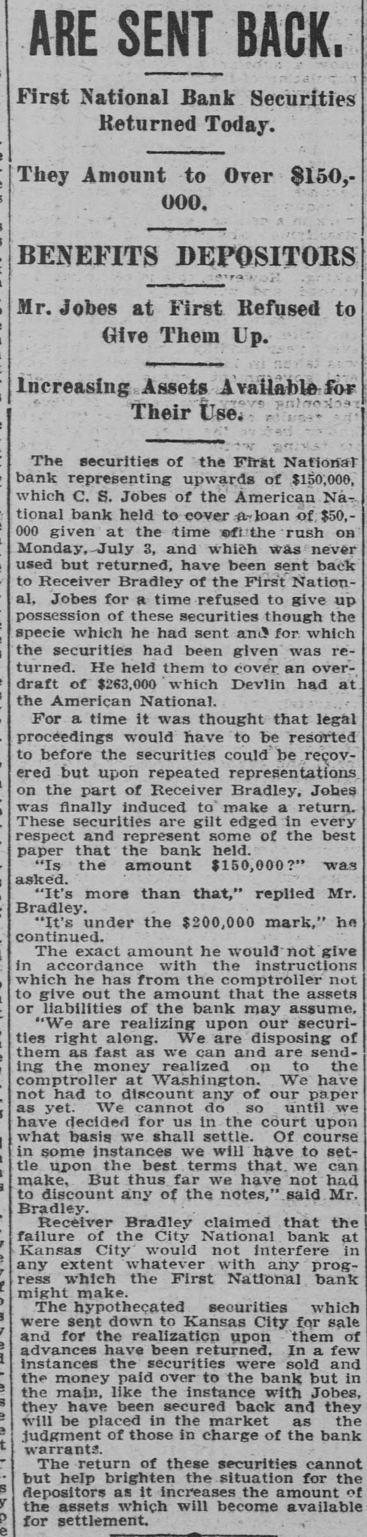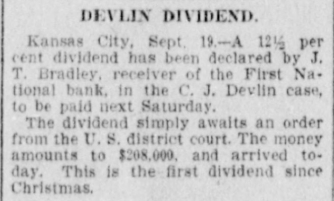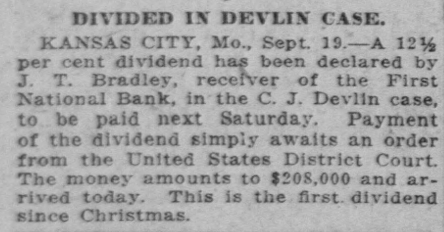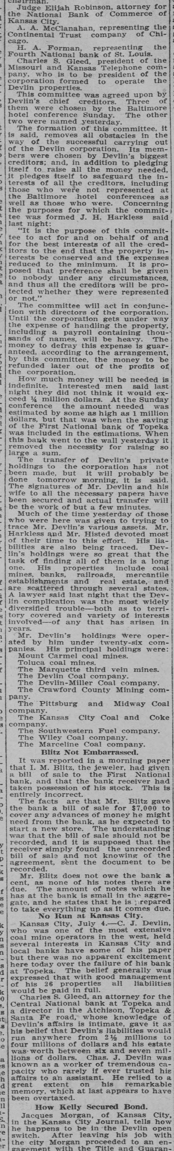 the Kansas Judge National City. Elijah Bank Robinson, of Commerce attorney for of Chicompany cago. ContiA McClanahan, A. Trust representing the of the H. A. Fourth Charles National Forman, representing Missouri and S. Gleed, bank president of St. Louis. be president comto of corporation pany, Devlin This who properties. is formed Kansas to Telephone operate of the the the Devlin's them committee chief was agreed upon two hotel were chosen creditors. by the Three Baltimore by of is way The said. were formation removes named of all Sunday. esterday. committee. The other of the of the successful obstacles in the it creditors: bers were Devlin chosen corporation. arrying Its mem- out itself and, in by Devlin's terests of all the to safeguard money were not it those pledges to who raise itself all addition the creditors. to pledging the needed. biggest the as those who conferences purposes for were. well the tee Baltimore hotel represented including inlast night: formed J. H. the was is the which Harkless Concerning commit- said tee for to the act for purpose and on of this commititors to best the interests of behalf of and terests be conserved end that the all property the cred- inreduced posed to the and the to nobody that under preference minimum shall It be expenses proand tected thus all the creditorcircumstances, any given or The not. whether they were will represented be procommittee tion corporation. Until the with the directors corporation will of the act in conjuneexpense including of handling gets under way sands anteed money of to names. defray a payroll this will containing be the heavy. property, thou- The by this according to the expense is guarof of out the profits refunded committe the arrangement. the corporation. later How is be will much needed money men indefinite. did night they ceed but that some was conference estimated of dollars. 1/4 million by the dollars. not amount think At the Sunday needed it would said last this was included National in bank the of so the bank First the was estimations when Topeka million saving When removed went to the of large The a sum. the necessity wall for yesterday raising holdings transfer done been made. to but the it corporation Devlin's wife The signatures to tomorrow of morning, Mr. will probably has is private not be been be the secured all the and necessary Devlin papers said. those Much work of of but actual transfer have will most trace Harkless who were Mr. Devlin's here the time was various yesterday given minutes to trying of to are bilities of their time and Mr. to this Histed devoted assets. Mr. is long lin's task holdin of also were being effort. traced. His liacoal include properties one. His finding all of so them great that Dev- the banks mines. railroads and establishments are lin diversified in complication lawyer scattered last through night real several that mercantile the states. Devtory trouble was the most involved years. Mr. covered Devlin's any and that variety -both has as of arisen to interests widely terri- in ated panies. by His him under holdings were operToluca Mount Carmel coal principal coal twenty-six mines. holdings were: commines. The The The Devlin Marquette Coal mines third company. vein The Devlin-Miller pany. Crawford County Coal Mining company. company. The The Pittsburg and Midway comcompany The Kansas City Coal and Coke Coal The The Southwestern Wiley Marceline Coal Coal company. mmany. Fuel It was Blitz reported Not Companya Embarrassed. I. that given and bank. bill M. of sale Blitz, to the in the jeweler. a morning had paper entirely taken possession incorrect that the of bank his First receiver National had bank a bill are of that Mr. need cover the The any facts advances sale stock. for Blitz $7.000 This gave start from a new the store. bank of as money he might was recorded that the bill of The sale understanding expected and receiver bill of sale simply and it found is supposed the should that not the be recorded. agreement. sent the not knowing unrecorded of the cent. Mr. Blitz does document to be due. as The none of not his owe the bank gate. has at and the he amount bank is small of notes in there which are to take No everything states up that notes he sprepared the was who Kansas City, Run at July Kansas City. comes due. coal several mine interests one operators of the in 4.-C. most the J. extensive Devlin, local but there banks was have in some Kansas of his west, City held and at here Topeka. today over no the apparent failure of excitement paper management all liabilities properties of expressed his 26 that The with belief good generally was his bank would Charles be paid S. Gleed. in full. a Central director National bank attorney for the Santa Fe road, in the Atchison Topeka and his Devlin's affairs is whose knowledge Topeka litles would run belief that intimate gave of lions of between six and his estate four was worth anywhere millions of from dollars liabilities 2 1/2 and millions it s le affairs known great pacity to who as dollars. an worker rarely Chas. if of tremendous J. Devlin seven mil. was d memory been overtaxed. extent which assistant at on last his appears to have remarkable He trusted relied to a his of in the Jacques How Kelly Morgan, Secured Bond. switch. he happens Kansas After to City be in Journal, the Kansas tells City, Guaranthe city Morgan with the leaving proceeded his and Devlin to job an open with