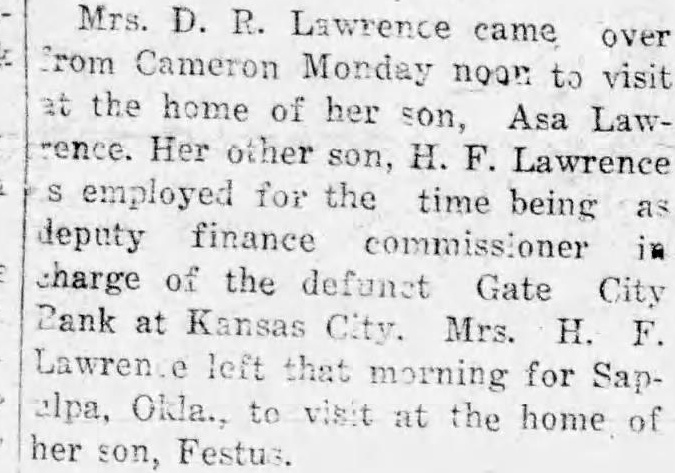 Mrs. D. R. Lawrence came over from Cameron Monday noon to visit at the home of her son, Asa Lawrence. Her other son, H. F. Lawrence S employed for the time being as deputy finance commissioner in charge of the defunct Gate City Bank at Kansas City. Mrs. H. F. Lawren e left that morning for Sapelpa, Okla., to visit at the home of her son, Festus.