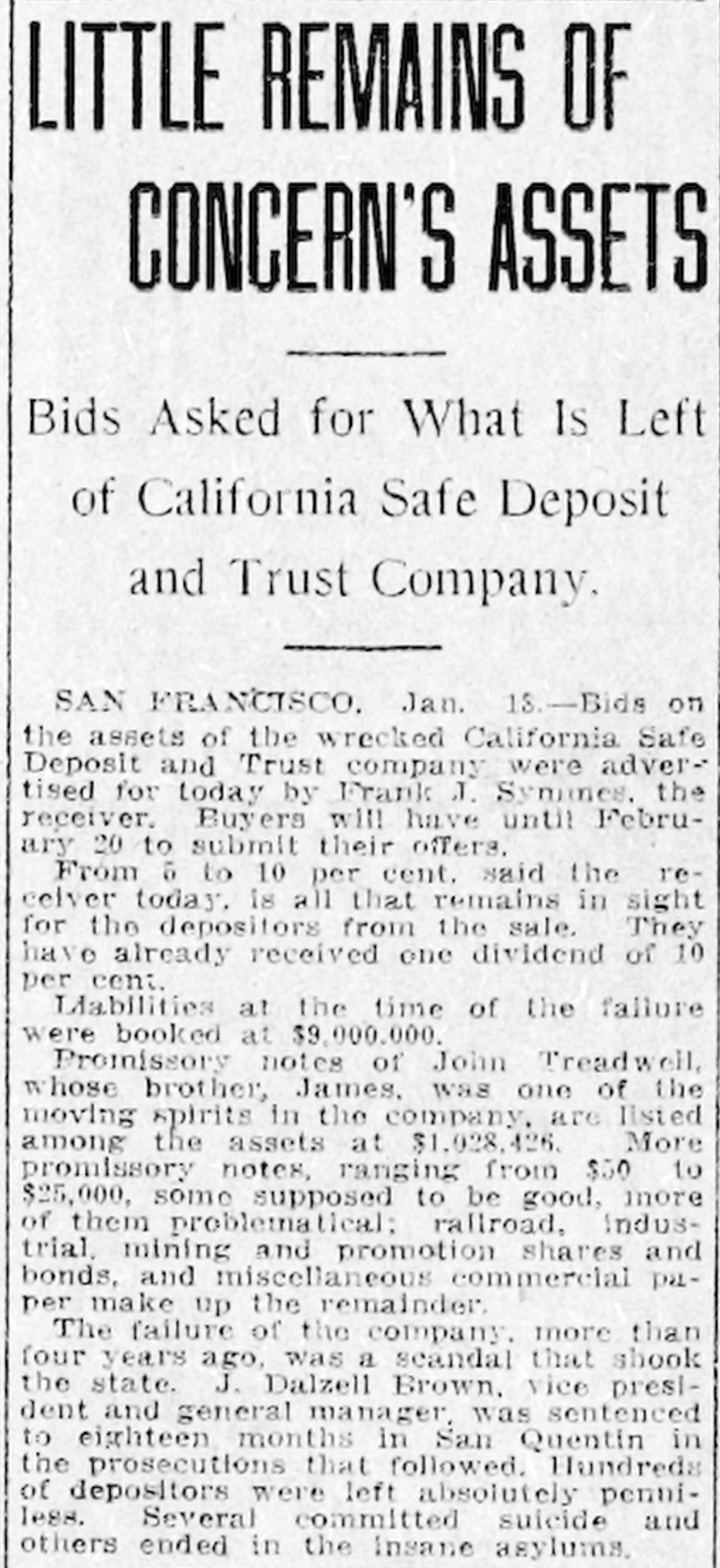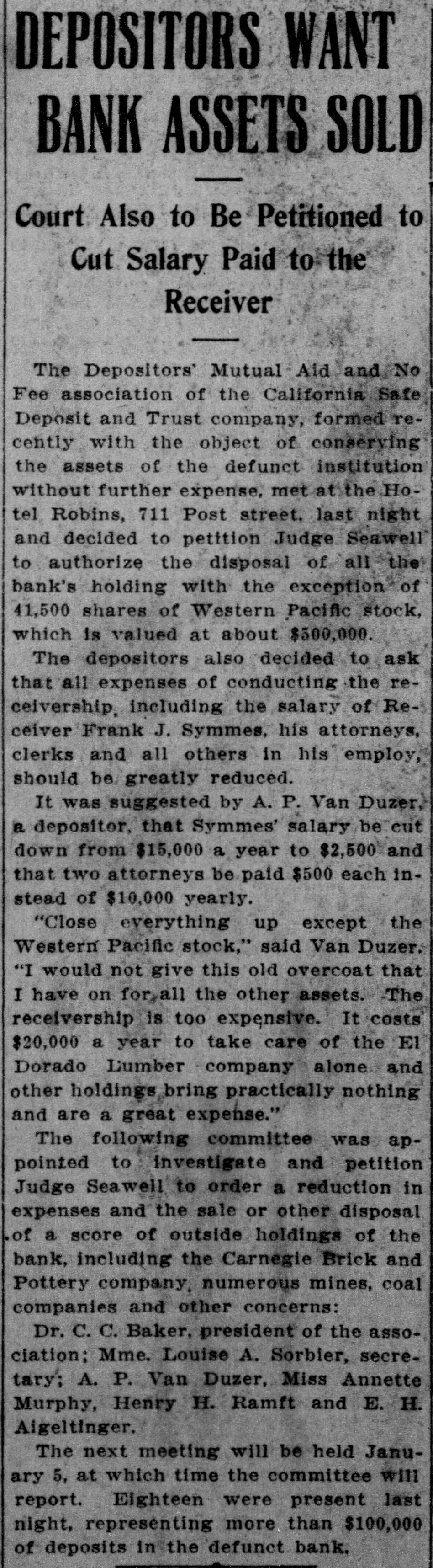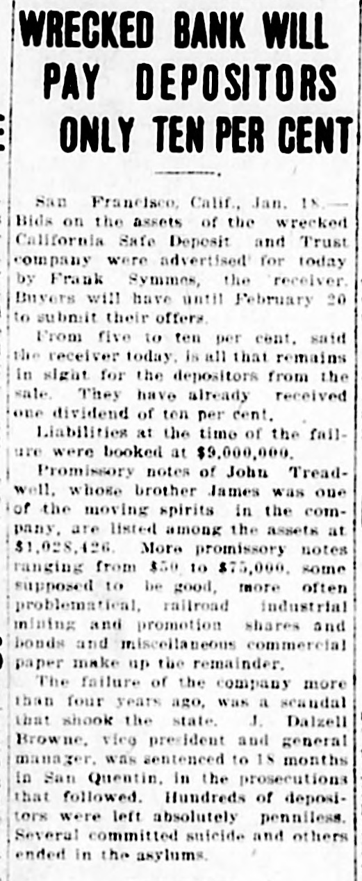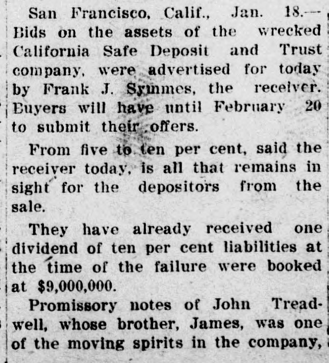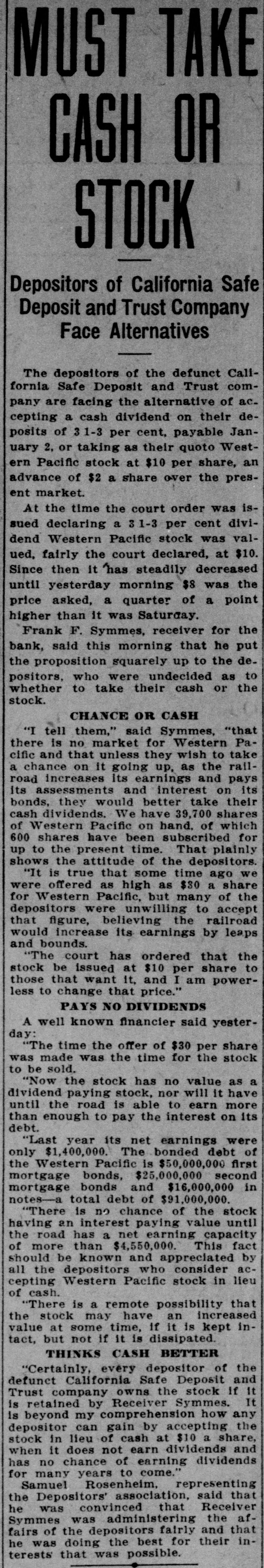 MUST TAKE CASH OR STOCK Depositors of California Safe Deposit and Trust Company Face Alternatives The depositors of the defunct Callfornia Safe Deposit and Trust company are facing the alternative of accepting a cash dividend on their deposits of 3 1-3 per cent, payable January 2, or taking as their quoto Western Pacific stock at $10 per share, an advance of $2 a share over the present market. At the time the court order was issued declaring a 3 1-3 per cent dividend Western Pacific stock was valued, fairly the court declared, at $10. Since then it has steadily decreased until yesterday morning $8 was the price asked, a quarter of a point higher than it was Saturday. Frank F. Symmes, receiver for the bank, said this morning that he put the proposition squarely up to the depositors, who were undecided as the to whether to take their cash or stock. CHANCE OR CASH tell them," said Symmes, "that no market for cific that unless they there "I and is Western wish the to rail- take Paa on it going up, as increases its earnings and on road its chance assessments interest and pays its bonds, they would better take their cash dividends. We have 39,700 shares of Western Pacific on hand. of which 600 shares have been subscribed for up to the present time. That plainly shows the attitude of the depositors. "It is true that some time ago we offered as high as $30 a share Pacific, but many were for depositors were Western unwilling to railroad accept of the that figure, believing the would increase its earnings by leaps and bounds. "The court has ordered that the stock be issued at $10 per share to less those to that change want that it, price." and I am powerPAYS NO DIVIDENDS A well known financier said yesterday: "The time the offer of $30 per share was made was the time for the stock to be sold. stock has no value as a stock, nor road is able to earn more dividend until "Now the the paying will it have than enough to pay the interest on its debt. "Last year its net earnings were The the Pacific is only Western $1,400,000. bonded $50,000,000 debt second first of bonds, $25,000,000 in bonds and total debt of mortgage notes-a mortgage $91,000,000. $16,000,000 "There is no chance of the stock having an interest paying value until the road has a net earning capacity of more than $4,550,000. This fact should be known and appreciated by all the depositors who consider accepting Western Pacific stock in lieu of cash. "There is a remote possibility that the stock may have an increased value at some time, if it is kept intact, but not if it is dissipated. THINKS CASH BETTER "Certainly, every depositor of the defunct California Safe Deposit and Trust company owns the stock If It it is retained by Receiver Symmes. is beyond my comprehension how any depositor can gain by accepting the stock in lieu of cash at $10 a share, when it does not earn dividends and has no chance of earning dividends for many years to come." Samuel Rosenheim, representing the Depositors' association, said that was convinced that Receiver he was administering the afthe depositors fairly the best for he fairs Symmes was of doing their and that interests that was possible.