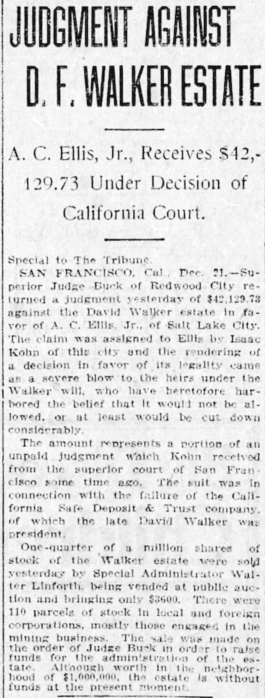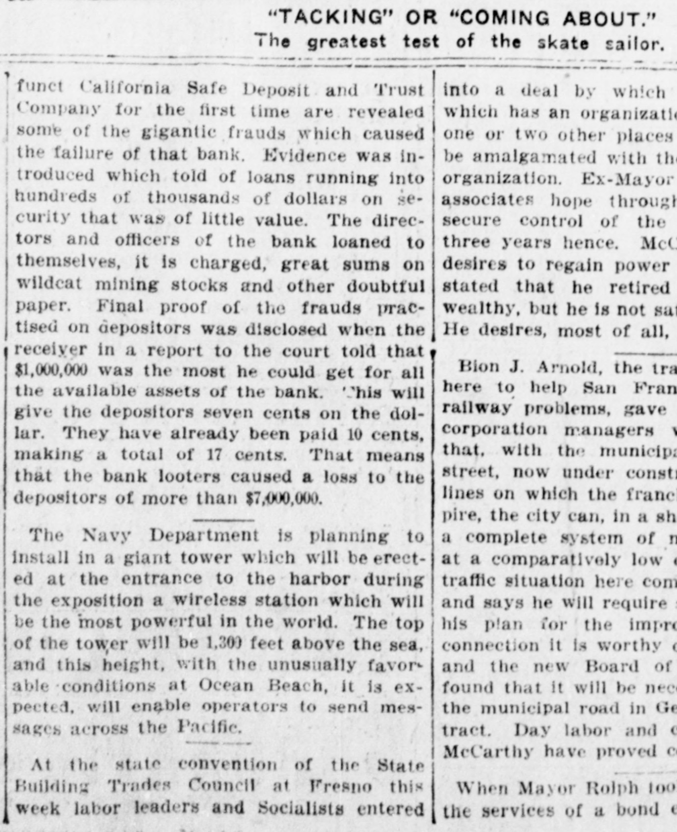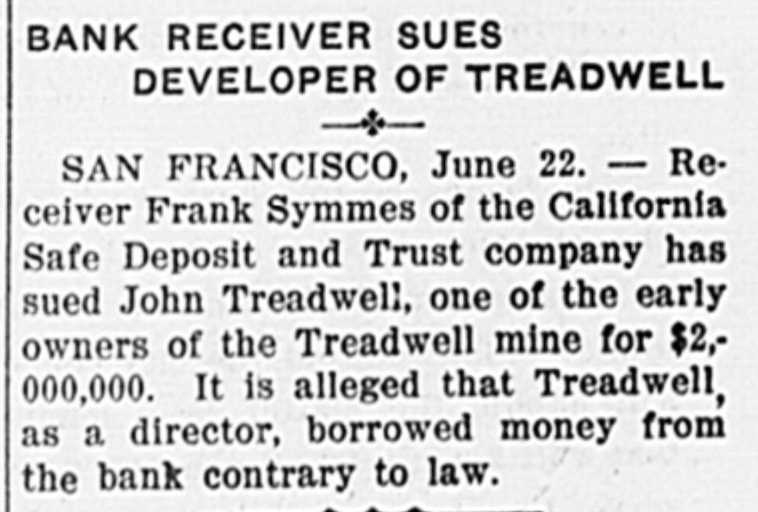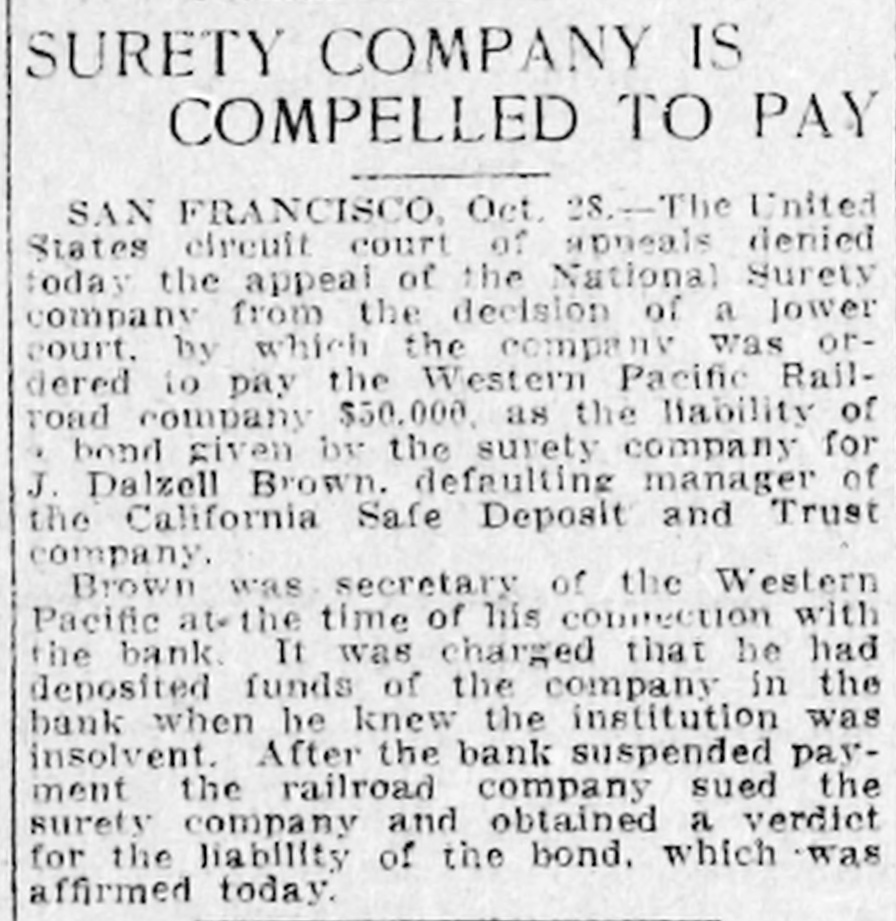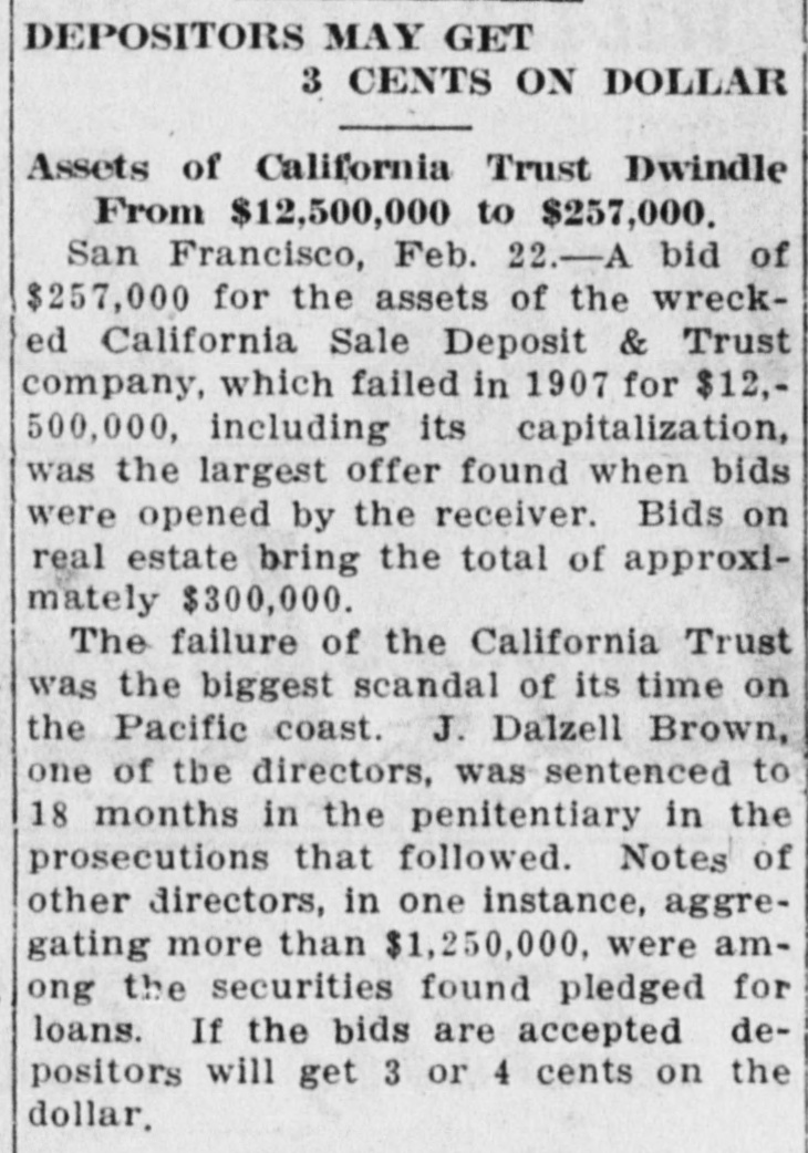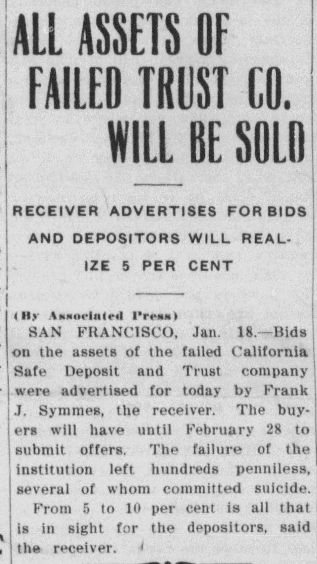 MUST TAKE CASH OR STOCK Depositors of California Safe Deposit and Trust Company Face Alternatives The depositors of the defunct Callfornia Safe Deposit and Trust company are facing the alternative of accepting a cash dividend on their deposits of 3 1-3 per cent, payable January 2, or taking as their quoto Western Pacific stock at $10 per share, an advance of $2 a share over the present market. At the time the court order was issued declaring a 3 1-3 per cent dividend Western Pacific stock was valued, fairly the court declared, at $10. Since then it has steadily decreased until yesterday morning $8 was the price asked, a quarter of a point higher than it was Saturday. Frank F. Symmes, receiver for the bank, said this morning that he put the proposition squarely up to the depositors, who were undecided as the to whether to take their cash or stock. CHANCE OR CASH tell them," said Symmes, "that no market for cific that unless they there "I and is Western wish the to rail- take Paa on it going up, as increases its earnings and on road its chance assessments interest and pays its bonds, they would better take their cash dividends. We have 39,700 shares of Western Pacific on hand. of which 600 shares have been subscribed for up to the present time. That plainly shows the attitude of the depositors. "It is true that some time ago we offered as high as $30 a share Pacific, but many were for depositors were Western unwilling to railroad accept of the that figure, believing the would increase its earnings by leaps and bounds. "The court has ordered that the stock be issued at $10 per share to less those to that change want that it, price." and I am powerPAYS NO DIVIDENDS A well known financier said yesterday: "The time the offer of $30 per share was made was the time for the stock to be sold. stock has no value as a stock, nor road is able to earn more dividend until "Now the the paying will it have than enough to pay the interest on its debt. "Last year its net earnings were The the Pacific is only Western $1,400,000. bonded $50,000,000 debt second first of bonds, $25,000,000 in bonds and total debt of mortgage notes-a mortgage $91,000,000. $16,000,000 "There is no chance of the stock having an interest paying value until the road has a net earning capacity of more than $4,550,000. This fact should be known and appreciated by all the depositors who consider accepting Western Pacific stock in lieu of cash. "There is a remote possibility that the stock may have an increased value at some time, if it is kept intact, but not if it is dissipated. THINKS CASH BETTER "Certainly, every depositor of the defunct California Safe Deposit and Trust company owns the stock If It it is retained by Receiver Symmes. is beyond my comprehension how any depositor can gain by accepting the stock in lieu of cash at $10 a share, when it does not earn dividends and has no chance of earning dividends for many years to come." Samuel Rosenheim, representing the Depositors' association, said that was convinced that Receiver he was administering the afthe depositors fairly the best for he fairs Symmes was of doing their and that interests that was possible.