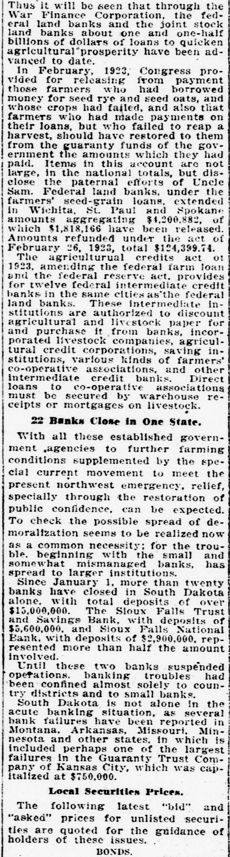Thus it will be seen that through the War Finance Corporation, the federal land banks and the joint stock land banks about one and one-half billions of dollars of loans to quicken agricultural prosperity have been advanced to date. In February, 1923, Congress provided for releasing from payment those farmers who had borrowed money for seed rye and seed oats, and whose crops had failed, and also that farmers who had made payments on their loans, but who failed to reap a harvest, should have restored to them from the guaranty funds of the government the amounts which they had paid. Items in this account are not large, in the national totals, but disclose the paternal efforts of Uncle Sam. Federal land banks, under the farmers' seed-grain loans, extended in Wichita, St. Paul and Spokane amounts aggregating $4,200.882, of which $1,818,166 have been released. Amounts refunded under the act of February 26, 1923, total $124,399.74. The agriculturual credits act of 1923, amending the federal farm loan and the federal reserve act, provides for twelve federal intermediate credit banks in the same cities as the federal land banks. These intermediate institutions are authorized to discount agricultural and livestock paper for and purchase it from banks, incorporated livestock companies, agricultural credit corporations, saving institutions, various kinds of farmers' co-operative associations, and other intermediate credit banks. Direct loans to co-operative associations must be secured by warehouse receipts or mortgages on livestock. ### 22 BANKS CLOSE IN ONE STATE. With all these established government agencies to further farming conditions supplemented by the special current movement to meet the present northwest emergency, relief, specially through the restoration of public confidence, can be expected. To check the possible spread of demoralization seems to be realized now as a common necessity; for the trouble, beginning with the small and somewhat mismanaged banks, has spread to larger institutions. Since January 1, more than twenty banks have closed in South Dakota alone, with total deposits of over $15,000,000. The Sioux Falls Trust and Savings Bank, with deposits of $5,600,000, and Sioux Falls National Bank, with deposits of $2,900,000, represented more than half the amount involved. Until these two banks suspended operations, banking troubles had been confined almost solely to country districts and to small banks. South Dakota is not alone in the acute banking situation, as several bank failures have been reported in Montana, Arkansas, Missouri, Minnesota and other states, in which is included perhaps one of the largest failures in the Guaranty Trust Company of Kansas City, which was capitalized at $750,000. ### LOCAL SECURITIES PRICES. The following latest "bid" and "asked" prices for unlisted securities are quoted for the guidance of holders of these issues. BONDS.