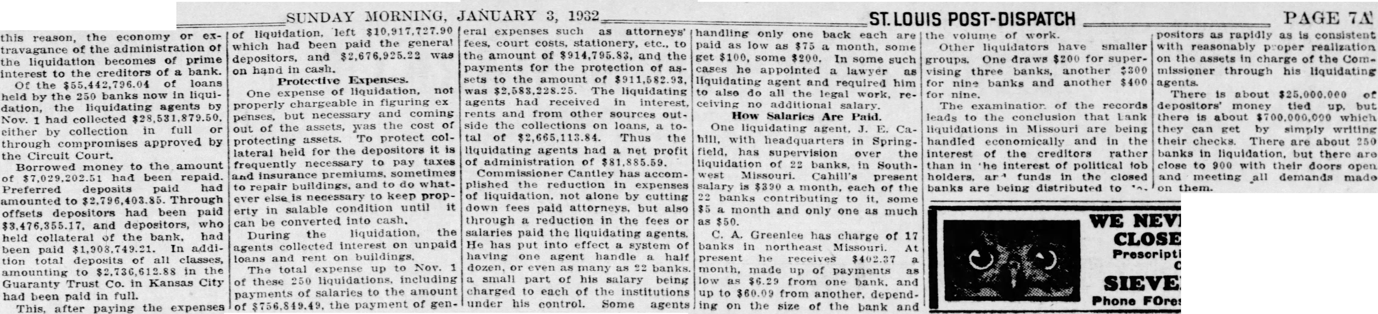 this reason, the economy or extravagance of the administration of the liquidation becomes of prime interest to the creditors of a bank. Of the $55,442,796.04 of loans held by the 250 banks now in liquidation, the liquidating agents by Nov. had collected 531,879.50, either by collection in full or through compromises approved by the Circuit Court. Borrowed money to the amount of $7,029,202.51 had been repaid. Preferred deposits paid had amounted to $2,796,403. Through offsets depositors had been paid $3,476,355.17, and depositors, who held collateral of the bank, had been paid $1,908,749.21. In addition total deposits of all classes, amounting to $2,736,612.88 in the Guaranty Trust Co. in Kansas City had been paid in full. This, after paying the expenses of liquidation, left $10,917,727.90 which had been paid the general depositors, and $2,676,925.22 was on hand in cash. Protective Expenses. One expense of liquidation, not properly chargeable in figuring ex penses, but necessary and coming out of the assets, was the cost of protecting assets. To protect collateral held for the depositors it is frequently necessary to pay taxes and insurance premiums, sometimes to repair buildings, and to do whatever else is necessary to keep property in salable condition until it can be converted into cash. During the liquidation, the agents collected interest on unpaid loans and rent on buildings The total expense up to Nov. 1 of these 250 liquidations. including payments of salaries to the amount of $756,849.49 the payment of gen- eral expenses such as attorneys' fees, court costs, stationery, etc., to the amount of $914,795.83, and the payments for the protection of assets to the amount of $911,582. 93, was $2,583,228.25. The liquidating agents had received in interest, rents and from other sources outside the collections on loans, a to. tal of $2,665,113.84. Thus the liquidating agents had a net profit of administration of Commissioner Cantley has accomplished the reduction in expenses of liquidation. not alone by cutting down fees paid attorneys. but also through a reduction in the fees or salaries paid the liquidating agents He has put into effect a system of having one agent handle half dozen, or even as many as 22 banks a small part of his salary being charged to each of the institutions under his control. Some agents ST.LOUIS POST-DISPATCH handling only one back each are the volume of work. paid as low as $75 a month, some Other liquidators have smaller get $100, some $200. In some such groups. One draws $200 for supercases he appointed a lawyer as vising three banks, another $300 liquidating agent and required him for nine banks and another $400 to also do all the legal work, re- for ceiving no additional salary. The examination of the records How Salaries Are Paid. leads to the conclusion that Lank One liquidating agent, J. E. Ca- liquidations in Missouri are being hill, with headquarters in Spring- handled economically and in the field, has supervision over the interest of the creditors rather liquidation of 22 banks, in South. than in he interest of political tob west Missouri. Cahill's present holders. ar funds in the closed salary is $390 a month, each of the banks are being distributed to 22 banks contributing to it, some $5 a month and only one as much as $50. WE NEVER C. A. Greenlee has charge of 17 CLOSE banks in northeast Missouri. At present he receives $402.37 a month, made up of payments as low as $6.29 from one bank. and up to $60.09 from another. depending on the size of the bank and positors as rapidly as is consistent with reasonably proper realization on the assets in charge of the Commissioner through his liquidating agents. There is about $25,000.000 of depositors' money tied up, but there is about $700,000,000 which they can get by simply writing their checks. There are about 250 banks in liquidation, but there are close to 900 with their doors open and meeting all demands made on them.