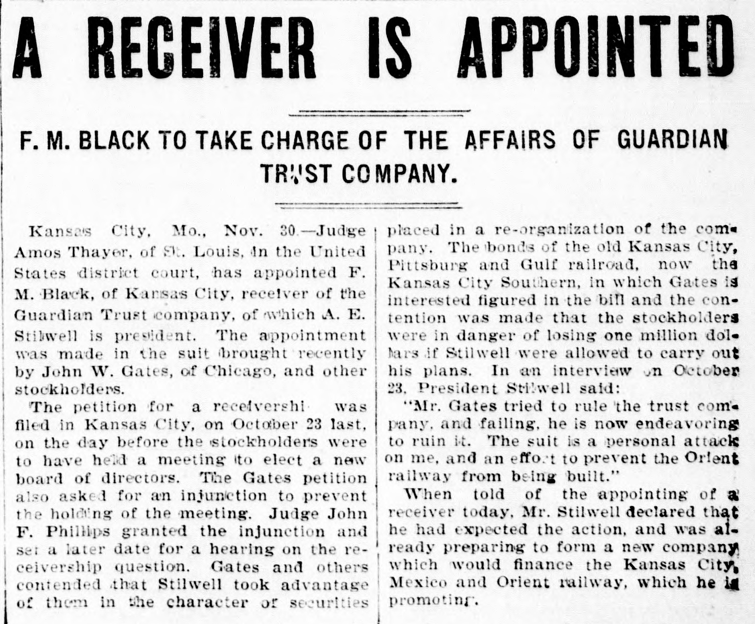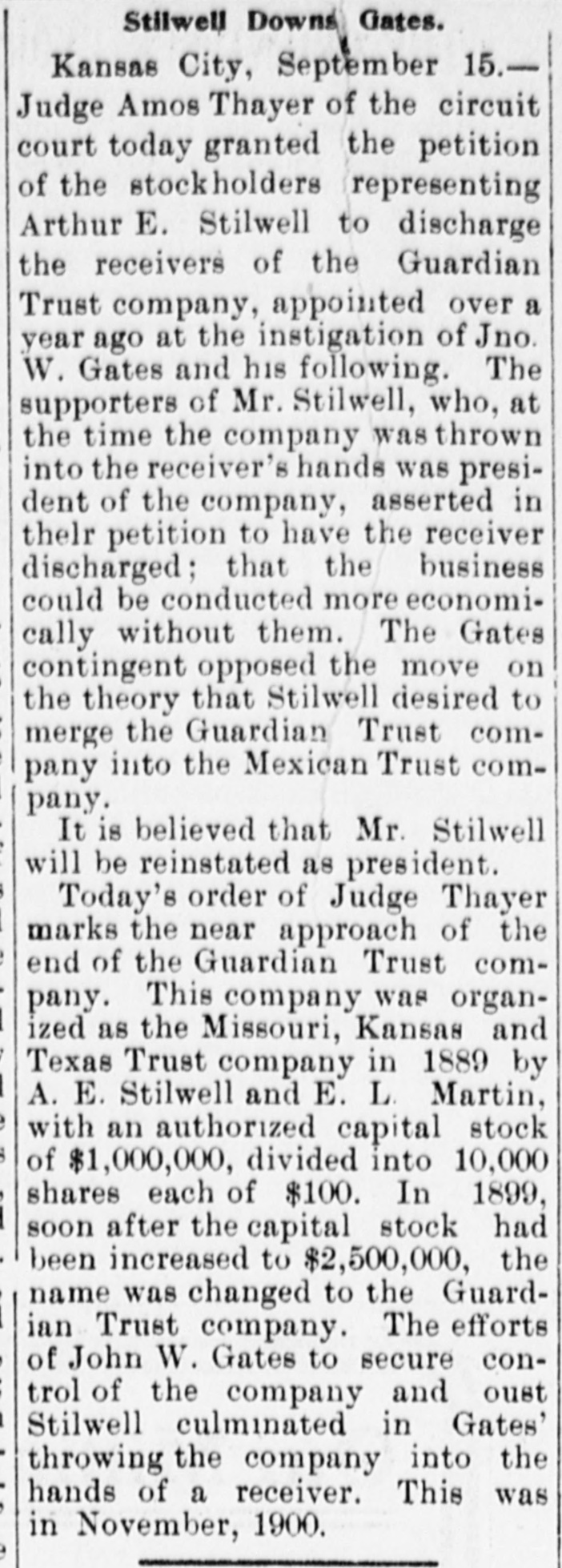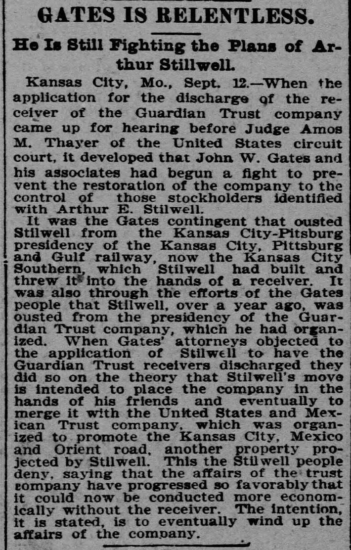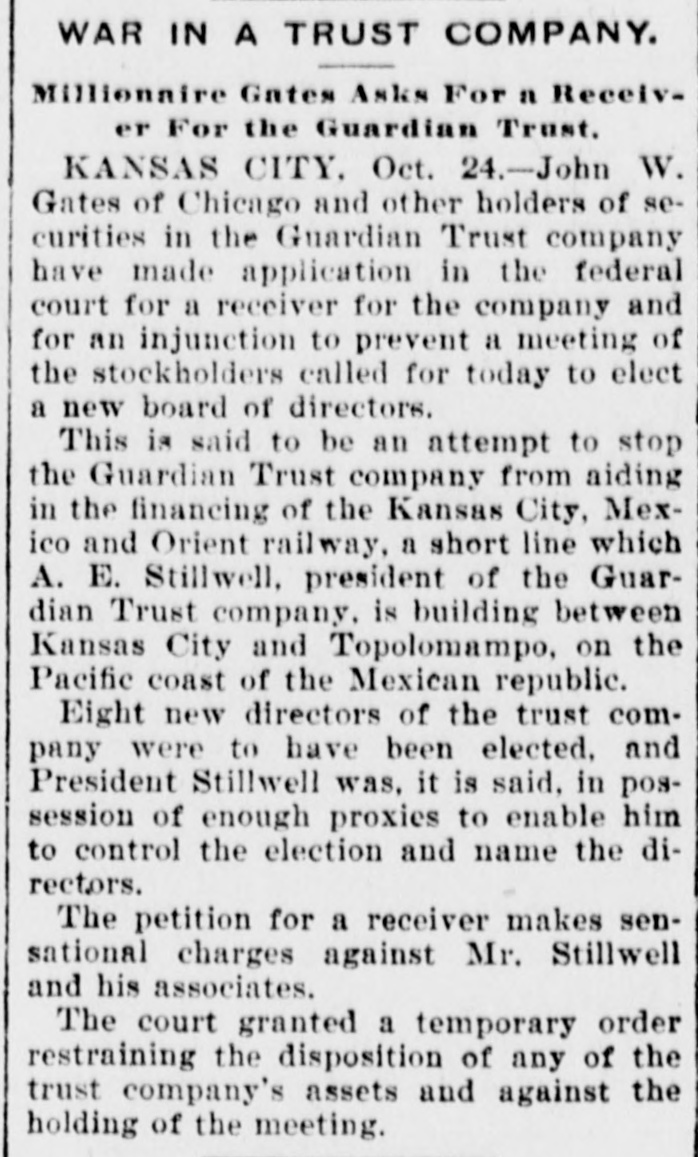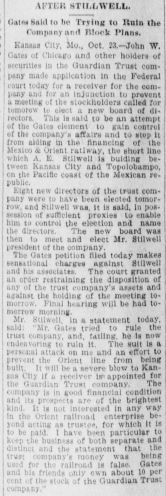 AFTER STILLWELL. Gates Said to be Trying to Ruin the Company and Block Plans. Kansas City, Mo., Oct. 23.-John W. Gates of Chicago and other holders of securities in the Guardian Trust company made application in the Federal court today for a receiver for the company and for an injunction to prevent a meeting of the stockholders called for tomorow to elect a new board of directors. This is said to be an attempt of the Gates element to gain control of the company's affairs and to stop it from aiding in the financing of the Mexico & Orient ratlway, the short line which A. E. Stilwell is buiding between Kansas City and Topolobampo, on the Pacific coast of the Mexican republic. Eight new directors of the trust company were to have been elected tomorrow, and Stilwell was, it is said, in possession of sufficient proxies to enable him to control the election and name the directors. The new board was then to meet and elect Mr. Stilwell president of the company. The Gates petition filed today makes sensational charges against Stilwell and his associates. The court granted an order restraining the disposition of any of the trust company's assets and against the holding of the meeting tomorrow. Final hearing will be had tomorrow morning. Mr. Stilwell, in a statement today, said: "Mr. Gates tried to rule the trust company, and, failing. he is now endeavoring to ruin it. The suit is a personal attack on me and an effort to prevent the Orient line from being built. It will be a severe blow to Kansas City If a receiver is appointed for the Guardian Trust company. The company is in good financial condition and its prospects are of the brightest kind. It is not interested in any way in the Orient railroad enterprise beyond acting as trustee, for which it is to be paid. I have been particular to keep the business of both separate and distinct and the statement that the trust company's money was being used for the railroad is false. Gates and his friends only own about 10 per cent of the stock of the Guardian Trust company."