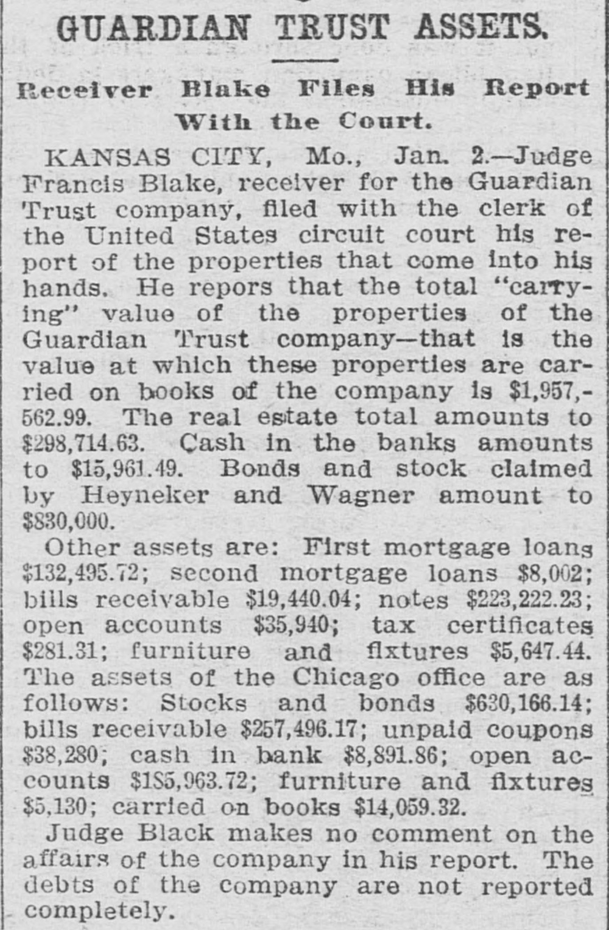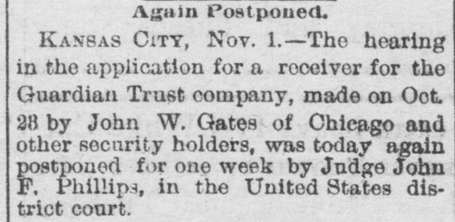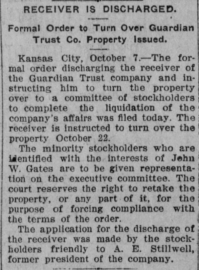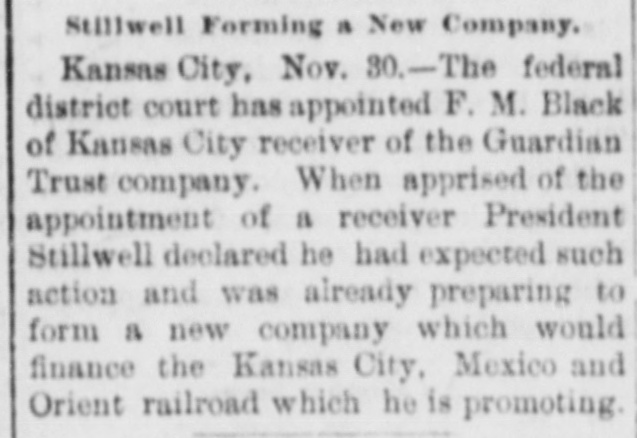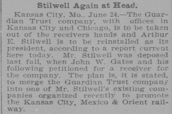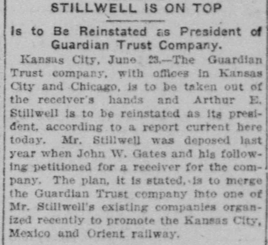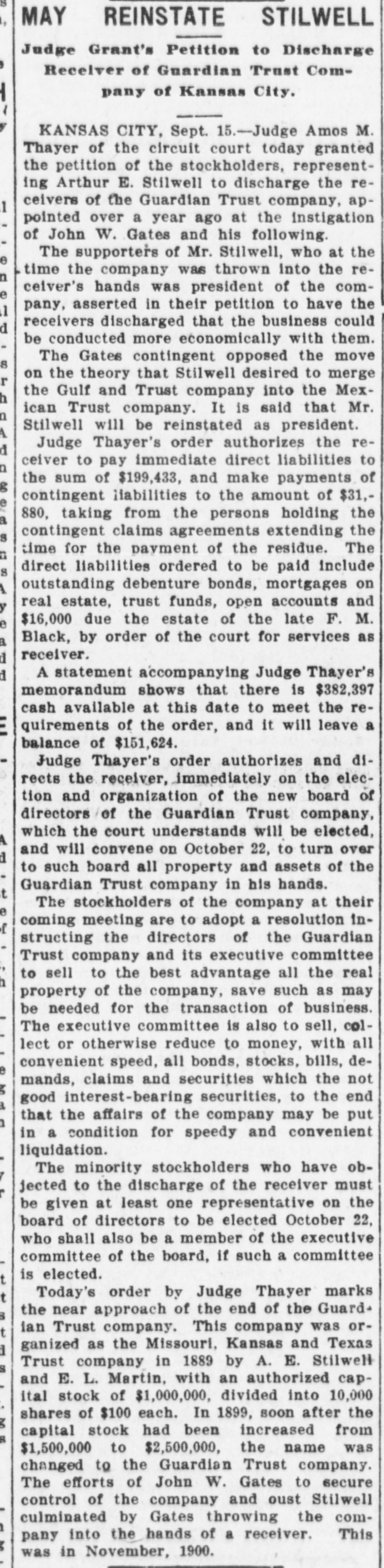 AFTER STILLWELL. Gates Said to be Trying to Ruin the Company and Block Plans. Kansas City, Mo., Oct. 23.-John W. Gates of Chicago and other holders of securities in the Guardian Trust company made application in the Federal court today for a receiver for the company and for an injunction to prevent a meeting of the stockholders called for tomorow to elect a new board of directors. This is said to be an attempt of the Gates element to gain control of the company's affairs and to stop it from aiding in the financing of the Mexico & Orient ratlway, the short line which A. E. Stilwell is buiding between Kansas City and Topolobampo, on the Pacific coast of the Mexican republic. Eight new directors of the trust company were to have been elected tomorrow, and Stilwell was, it is said, in possession of sufficient proxies to enable him to control the election and name the directors. The new board was then to meet and elect Mr. Stilwell president of the company. The Gates petition filed today makes sensational charges against Stilwell and his associates. The court granted an order restraining the disposition of any of the trust company's assets and against the holding of the meeting tomorrow. Final hearing will be had tomorrow morning. Mr. Stilwell, in a statement today, said: "Mr. Gates tried to rule the trust company, and, failing. he is now endeavoring to ruin it. The suit is a personal attack on me and an effort to prevent the Orient line from being built. It will be a severe blow to Kansas City If a receiver is appointed for the Guardian Trust company. The company is in good financial condition and its prospects are of the brightest kind. It is not interested in any way in the Orient railroad enterprise beyond acting as trustee, for which it is to be paid. I have been particular to keep the business of both separate and distinct and the statement that the trust company's money was being used for the railroad is false. Gates and his friends only own about 10 per cent of the stock of the Guardian Trust company."