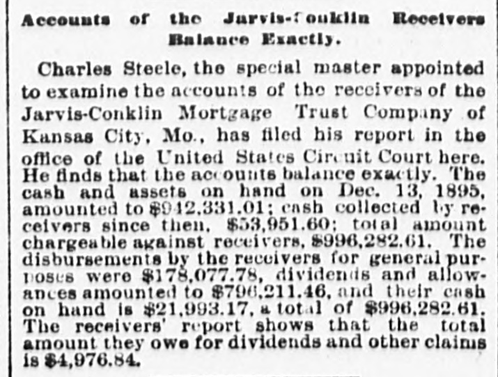 JARVIS-CONKLIN RECEIVERS DISCHARGED BY JUDGE PHILIPS. THE COMPANY FAILED IN 1893. ITS AFFAIRS ARE NOW PRACTICALLY WOUND UP. Developments in the Matter of the Standard Liquor Company and the Missouri National Bank -Criminal Court Docket-Court News. In the federal court yesterday Judge Philips approved the final report of the receivers of the Jarvis-Conklin Mortgage Trust Company and made an order discharging them from further service and releasing their bonds. This closes the receivership so far as this court is concerned. The proceedings in this court were ancillary, the original proceedings being had in court in New York city, where the original order of appointment of the receivers was made. The discharge of the receivers in this court is the preliminary step to their final discharge in the court of original jurisdiction, in New York, where the application for complete discharge will be made within the next thirty days. When they are discharged there the entire legal business connected with the failure of the company will be finished and the adjustment of its business affairs will have been completed. The company failed for nearly $14,000,000 in October, 1893, going down a few weeks after the Lombard Company collapsed. At that time the affairs of the company and its many allied corporations were tangled to a most perplexing degree and interests conflicted at a large number of points. The work of straightening out the entanglement was begun in the courts and has been pushed along as rapidly as was possible, and is now practically closed. The assets have been sold at foreclosure and have in nearly all instances been purchased by representatives of the new company with which the promoters of the old corporation are connected and which they practically control in New York city. It has been a rapid settlement of a mass of perplexing business and all parties who have been parties to the litigation will feel a great sénse of relief that it has finally been disposed of.