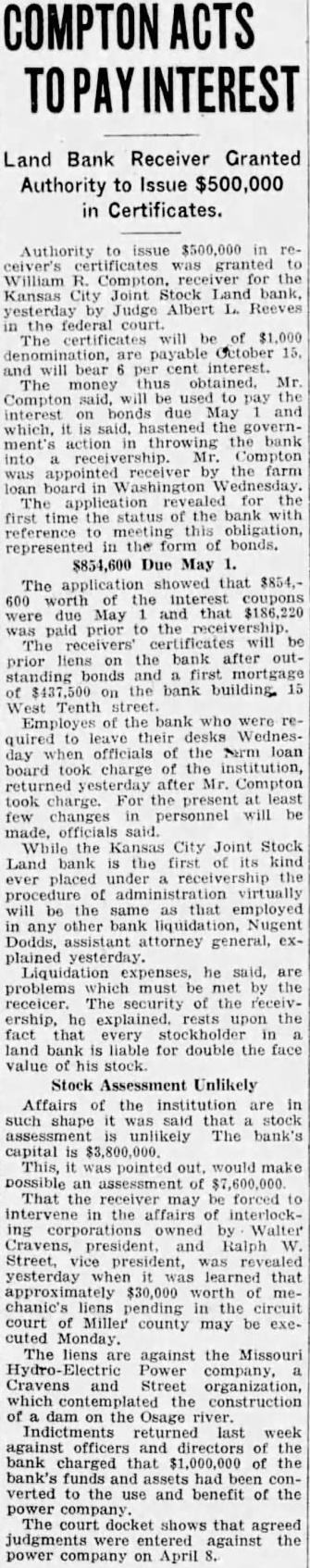 The Missouri Power company, organized by Waiter Cravens, president of the defunct Kansas City Joint Stock Land bank, to develop gigantic power plant in the Missouri Ozarks. and in which $1,700,000 of the bank's funds are invested, may be taken over by an Eastern banking house, it was learned yesterday. If the deal carried to completion, this would release the money the bank has in the power company for liquidation or reorganization of the bank. Receiver Inspects Site, William Compton, receiver for the made financial the federal farm the Friday the site plant the land held Farmers' Fund, another organidistrict which would located. will return to Kansas City Mr. Compton preparing to petithe federal court turn bank the assets of the Farmers' Fund which he stated his rightfully bank, Farmers' Fund also in organized by Cravens to obtain posed 100-mile long which furnish power for the Should project be carried completion, nearly worthless, would become extremely valuable. Should the federal court fit turn over land bank, large sum could be realized from
