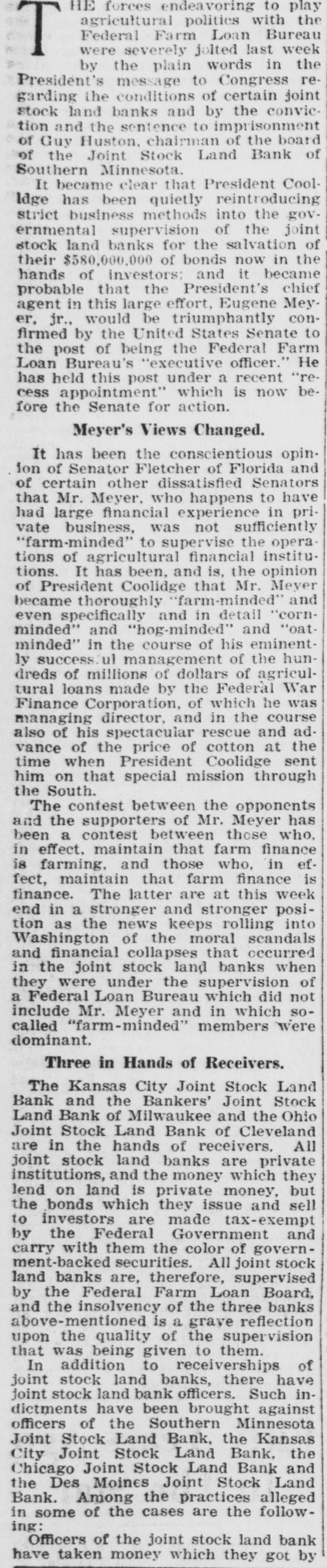 play agricultural politics with the Federal Farm Loan Bureau were severely jolted last week by the plain words in the President's message to Congress regarding the conditions of certain joint stock land banks and by the conviction and the sentence to imprisonment of Guy Huston, chairman of the board of the Joint Stock Land Bank of Southern Minnesota. It became clear that President CoolIdge has been quietly reintroducing strict business methods into the governmental supervision of the joint stock land banks for the salvation of their $580,000,000 of bonds now in the hands of investors: and it became probable that the President's chief agent in this large effort, Eugene Meyer, jr., would be triumphantly confirmed by the United States Senate to the post of being the Federal Farm Loan Bureau's "executive officer." He has held this post under a recent "recess appointment" which is now before the Senate for action. Meyer's Views Changed. It has been the conscientious opinion of Senator Fletcher of Florida and of certain other dissatisfied Senators that Mr. Meyer, who happens to have had large financial experience in private business, was not sufficiently "farm-minded" to supervise the operations of agricultural financial institutions. It has been, and is, the opinion of President Coolidge that Mr. Meyer became thoroughly "farm-minded" and even specifically and in detail "cornminded" and "hog-minded" and "oatminded" in the course of his eminently success ul management of the hundreds of millions of dollars of agricultural loans made by the Federal War Finance Corporation, of which he was managing director, and in the course also of his spectacular rescue and advance of the price of cotton at the time when President Coolidge sent him on that special mission through the South. The contest between the opponents and the supporters of Mr. Meyer has been a contest between those who, in effect. maintain that farm finance is farming. and those who, in effect, maintain that farm finance is finance. The latter are at this week end in a stronger and stronger position as the news keeps rolling into Washington of the moral scandals and financial collapses that occurred in the joint stock land banks when they were under the supervision of a Federal Loan Bureau which did not include Mr. Meyer and in which socalled "farm-minded" members were dominant. Three in Hands of Receivers. The Kansas City Joint Stock Land Bank and the Bankers' Joint Stock Land Bank of Milwaukee and the Ohio Joint Stock Land Bank of Cleveland are in the hands of receivers. All joint stock land banks are private institutions, and the money which they lend on land is private money, but the bonds which they issue and sell to investors are made tax-exempt by the Federal Government and carry with them the color of government-backed securities. All joint stock land banks are, therefore, supervised by the Federal Farm Loan Board, and the insolvency of the three banks above-mentioned is a grave reflection upon the quality of the supervision that was being given to them. In addition to receiverships of joint stock land banks, there have joint stock land bank officers. Such indictments have been brought against officers of the Southern Minnesota Joint Stock Land Bank, the Kansas City Joint Stock Land Bank, the Chicago Joint Stock Land Bank and the Des Moines Joint Stock Land Bank. Among the practices alleged in some of the cases are the following: Officers of the joint stock land bank