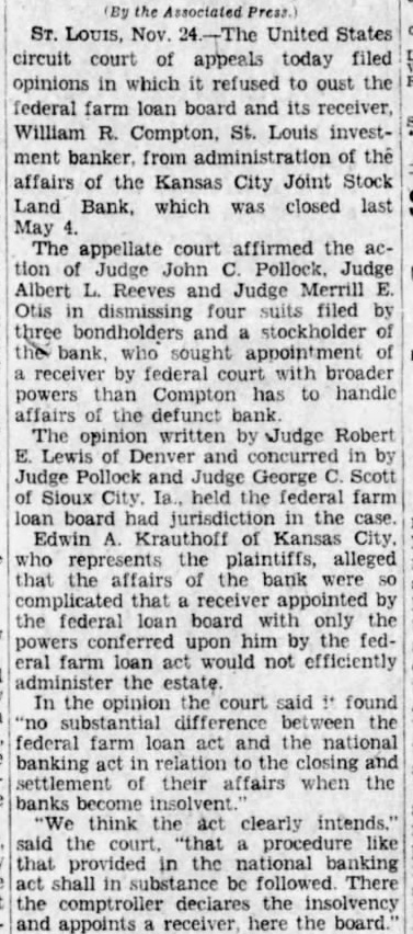 affairs of the Kansas City Joint Stock Land Bank, which was closed last May The appellate court affirmed the action Judge John Judge Albert Reeves Judge Merrill Otis dismissing four filed bondholders and stockholder sought appointment receiver federal court with broader powers Compton to handle affairs the defunct The opinion written Judge Robert Lewis of Denver and concurred in Judge Pollock Judge George Scott Sioux City. held the federal farm board jurisdiction in the Edwin of represents the alleged affairs the bank complicated appointed the federal board with only upon eral farm act not efficiently In the opinion court said found the federal farm act and the banking the and their affairs when the banks think act clearly intends." said procedure that national banking shall in be There the comptroller declares the insolvency appoints receiver here the board.'