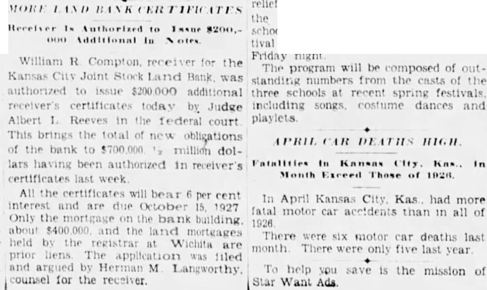 William R Compton receiver for the Kansas City Joint Stock Land Bank was authorized to issue $200,000 additional receiver's certificates today by Judge Albert L Reeves in the federal court This brings the total of new obligations APRIL IR DEATHS HIGH of the bank to $700,000 12 million dollars having been authorized in receiver's Month Exceed Those of 1926. certificates last week All the certificates will bear per cent In April Kansas City, Kas had more interest and are due October 15. 1927 fatal motor car accidents than in all of Only the on the bank building. 1926 about $400.000 and the land mortgages There were six motor car deaths last held by the registrar at Wichita are month There were only five last year prior liens The application was filed and argued by Herman M Langworthy To help you save is the mission of counsel for the receiver. Star Want Ads