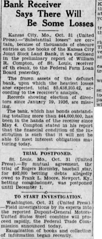 Kansas City, Mo., Oct. 31 (United are cerbecause the the City Joint Land report William Compton, receiver th ebank. the Federal Farm Loan Board yesterday. The frozen assets of the defunct bank, upon which the expected. total cording analysis. directors since January 19, 1926, are miss-