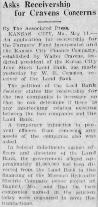 By The Associated Press. KANSAS CITY, Mo., May An application for receivership for the Farmers' Fund Incorporated the Kansas City Finance Company established Walter Cravens, dicted the Kansas City Joint Stock Land Bank, was made yesterday by Compton, Land Bank The petition of the Land Bank states for the two companies necessary that determine there any interlocking relation existing between the two companies and Land Bank. temporary injunction to vent officers from removing assets of the companies In federal indictments against and directors the Land Bank, the government alleged proximately had been verted from the Land Bank to the of the Electric Company power project at Bagnell, that the companies named today organized cover the
