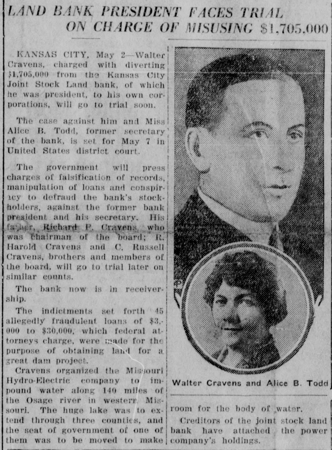 LAND BANK PRESIDENT FACES TRIAL ON CHARGE OF MISUSING $1,705,000 KANSAS CITY, May Walter Cravens, charged with diverting $1,705,000 from the Kansas City Joint Stock Land bank, of which he was president, to his own corporations, will go to trial soon. The case against him and Miss Alice B. Todd, former secretary of the bank, is set for May 7 in United States district court. The government will press charges of falsification of records, manipulation of loans and conspiracy to defraud the bank's stockholders, against the former bank president and his secretary. His father, Richard P. Cravens who was chairman of the board; R. Harold Cravens and C. Russell Cravens, brothers and members of the board, will go to trial later on similar counts. The bank now is in receivership. The indictments set forth 45 allegedly frandulent loans of $3.000 to $30,000, which federal attorneys charge, were made for the purpose of obtaining land for a great dam project. Cravens organized the Missouri Hydro-Electric company to imWalter Cravens and Alice B. Todd pound water along 140 miles of the Osage river in western. Misroom for the body of water. souri. The huge lake was to extend through three counties, and Creditors of the joint stock land the seat of government of one of bank have attached the power them was to be moved to make company's holdings.