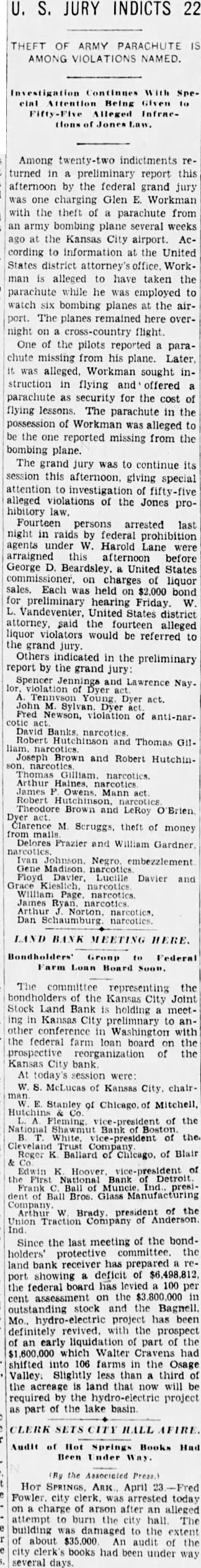 Among twenty-two indictments returned in preliminary report this afternoon by the federal grand jury one charging Glen E. Workman with the theft of parachute from an army bombing several weeks ago at the Kansas City airport. According to information the United States district Workman alleged to have taken the parachute while he was employed to watch six bombing planes at the airport. The planes here overnight on cross-country flight. One of the pilots reported parachute missing from his plane. Later, was alleged, Workman sought instruction flying and offered parachute security for the cost of flying lessons. The parachute in the possession of Workman was alleged to be the reported missing from the bombing plane. The grand jury was to continue its session afternoon. giving special attention investigation of alleged violations of the Jones prohibitory Fourteen persons arrested last night raids federal prohibition agents under W. Harold Lane were arraigned this afternoon before George Beardsley United States commissioner, charges of liquor sales. Each was held $2,000 bond for preliminary hearing Friday Vandeventer, United district attorney. said the fourteen alleged liquor violators would be referred to the grand Others indicated in the preliminary report by the grand jury: Spencer and Lawrence Nay. violation Dyer act. Fred of anti-narnarcotics. Thomas GilBrown and Robert HutchinThomas Gilliam. narcotics. Arthur James Mann Theodore Brown LeRoy Brien Clarence M theft of money Delores Frazier and William Gardner. Gene Madison Johnson, Negro. embezzlement Floyd Davier and William Page narcotics James Dan Schaumburg.