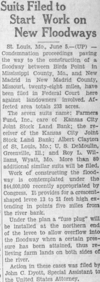 St. Louis, Mo., June proceedings paving the way to the of floodway between Birds Point in Mississippi County, Mo., and New Madrid New Madrid County, Missouri, miles, have been filed in Federal Court here against landowners involved. Affected area totals 233 acres. The seven suits name: Farmers Fund, Inc., Kansas City Joint Stock Land Bank; the ceiver of the Kansas City Joint Stock Land Bank; Albert Clayton Louis, DeMoulin, Greenville, and Roy WilWyatt, Mo. More than 80 liams, additional similar suits will be filed. Work of constructing the floodunder the way contemplated $44,000,000 recently appropriated by Congress. provides for crescentlevee 13 to feet high exshaped tending in points five miles from the river bank. Under the plan "fuse plug" will installed at the northern end of the levee to allow overflow into the floodway when certain presbeen attained, thus resure has lands on both sides of lieving farm the river. these cases was filed by Action in Special Assistant to John Dyott, the United States Attorney.