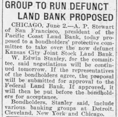 CHICAGO, June 2.-A. P. Stewart of San Francisco, president of the Pacific Coast Land Bank, today proposed to protective committee to take over the now defunct Kansas City Joint Stock Land Bank. W. Edwin Stanley, for the committee. said negotiations will be continued tomorrow. If the representatives of the bondholders agree, the proposal will be submitted for approval to the Federal Land Bank. If approved. it will then be put before the bondholders for acceptance. Bondholders, Stanley said, include various banking groups Detroit, Cleveland. New York and Chicago.