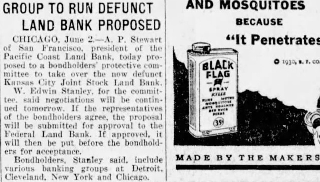 CHICAGO. June 2-A. P. Stewart "It Penetrates" of San Francisco, president of the Pacific Coast Land Bank, today proposed to bondholders' protective com BLACK mittee to take over the now defunct FLAG Kansas City Joint Stock Land Bank. W. Edwin Stanley. for the commit- SPRAY tee. said negotiations will be continued tomorrow. If the representatives of the bondholders agree, the proposal will be submitted for approval to the Federal Land Bank approved, will then be put before the bondholders for acceptance. MADE Y THE MAKERS Bondholders, Stanley said. include various groups Detroit. Cleveland. New York and Chicago.