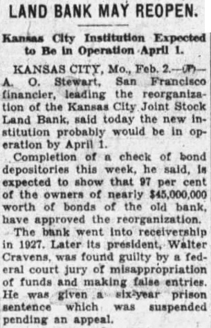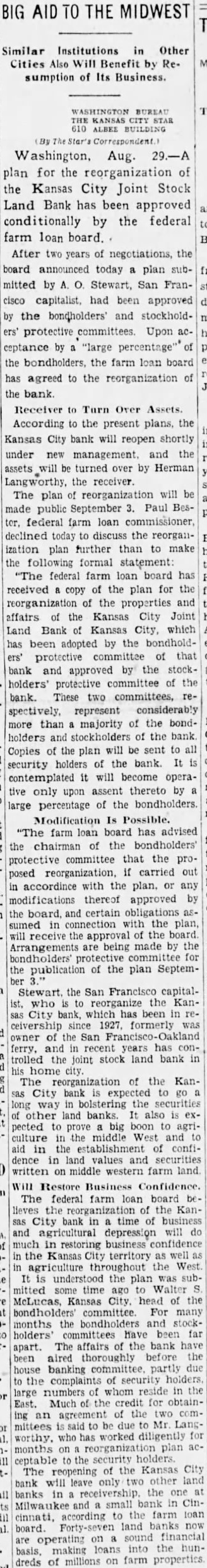 Washington, Aug. plan for the reorganization of the Kansas City Joint Stock Land Bank has been approved by the federal farm loan board. After two years of negotiations, the board announced today plan submitted by San Francapitalist, had approved the bondholders' and stockholders' protective committees. Upon acceptance "large the the farm loan board has agreed the reorganization the bank. Receiver to Turn Over Assets. According the present plans, the Kansas bank will reopen shortly under management. and the assets turned over Herman Langworthy, the receiver. The plan reorganization will be made public Paul Besfederal farm loan declined discuss the ization plan further than to make formal statement: federal farm board has received of the plan for the reorganization the properties and affairs Kansas Joint Land Bank Kansas which has adopted by the that the holders' protective committee the bank. These two committees, spectively, represent considerably than majority of the bondholders stockholders bank Copies the plan will sent to security holders the bank. It contemplated become operative only upon assent thereto by large percentage of the bondholders. Modification Is "The farm has advised the the bondholders' protective the proreorganization, if carried out accordince the plan. any modifications thereof approved by the board, and certain the plan, the Arrangements are being made by the bondholders' of the plan SeptemStewart the San Francisco capitalwho reorganize the KanCity bank, which has been in ceivership since formerly owner San ferry, and recent years has trolled the land bank home of the KanCity the other land banks pected big culture middle West and confiand written farm land The federal farm loan the Kanbank in time depression will business City territory West. the plan Walter McLucas, head the bondholders' committee For many months bondholders holders' committees have far apart. The affairs the bank aired before the house banking partly the complaints security numbers whom reside in the Much the credit for obtainagreement two Langmittees worthy. worked diligently reorganization the of Kansas City will two banks the Cinfarm loan according banks now board. the dreds of millions on farm