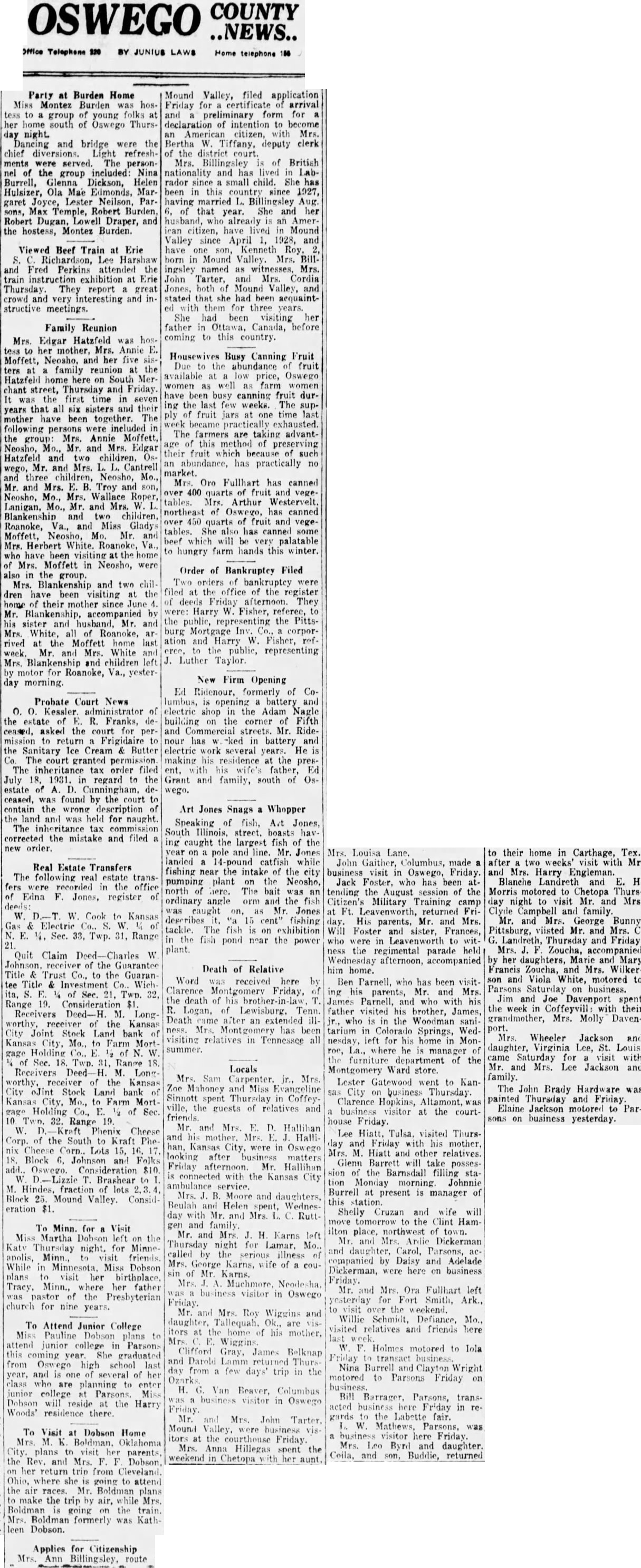 Mrs. Louisa Lane. John Gaither, Columbus, made business visit in Oswego, Friday. Jack Foster, who has been tending the August session of the Citizen's Military Training camp Leavenworth, returned Friday. His parents, Mr. and Mrs. Will Foster sister, Frances, in Leavenworth regimental parade afternoon, accompanied him home. Ben Parnell, who has been visitparents, Mr. and Mrs. James Parnell, and his father visited his brother, James, who is Woodman tarium Colorado Springs, nesday, left for home Monwhere manager furniture department the Montgomery store. Lester Gatewood went to KanCity business Thursday. Clarence Hopkins, Altamont, business visitor at the courthouse Friday. Lee Hiatt. Tulsa, visited Thursand Friday his mother, Hiatt and other relatives. Glenn Barrett will possesthe Barnsdall filling staMonday morning Johnnie Burrell at present is manager this Shelly Cruzan and wife will tomorrow the Clint Hamplace, northwest town. Ardie Dickerman and Carol, Parsons, companied Daisy and Adelade Dickerman, were here on business Friday Mr. and Mrs Ora Fullhart left yesterday for Fort Smith, Ark., the weekend. Willie Schmidt, Defiance, Mo. visited relatives and friends here Holmes motored to lola Friday transact business Nina and Clayton Wright motored to Parsons Friday Bill Barrager, Parsons, transacted business here Friday in gards Labette Mathews, Parsons, business visitor Friday. Mrs. Leo Byrd and daughter Coila, Buddie, returned to their home in Carthage, Tex., after visit with Mr. Mrs. Harry Engleman. Blanche and H. Morris motored to Chetopa Thursnight visit Mr. and Mrs. Clyde Campbell and family. Mr. George Bunny, Pittsburg, viisted Mr. and Mrs. Landreth, Thursday and Friday. Mrs. Zoucha, accompanied her daughters, Marie and Mary Francis Zoucha, and Mrs. Wilkerson and Viola White, motored to Parsons Saturday business. Jim and Joe Davenport spent the week Coffeyvill: their grandmother, Mrs. Molly DavenWheeler Jackson and daughter, Lee, St. Louis, Saturday for with Mr. and Mrs. Jackson family. The John Brady Hardware was painted Thursday and Friday Elaine Jackson motored Parsons on business yesterday.