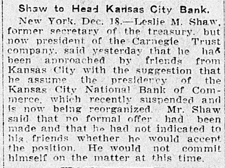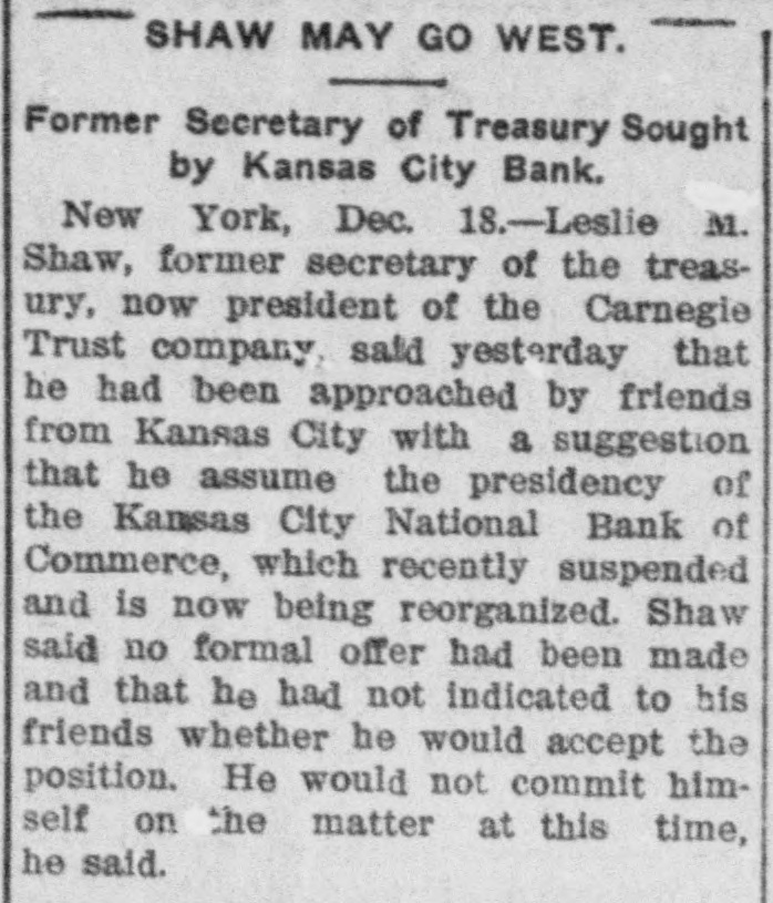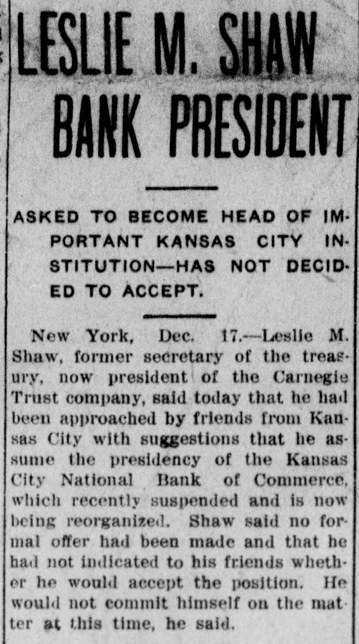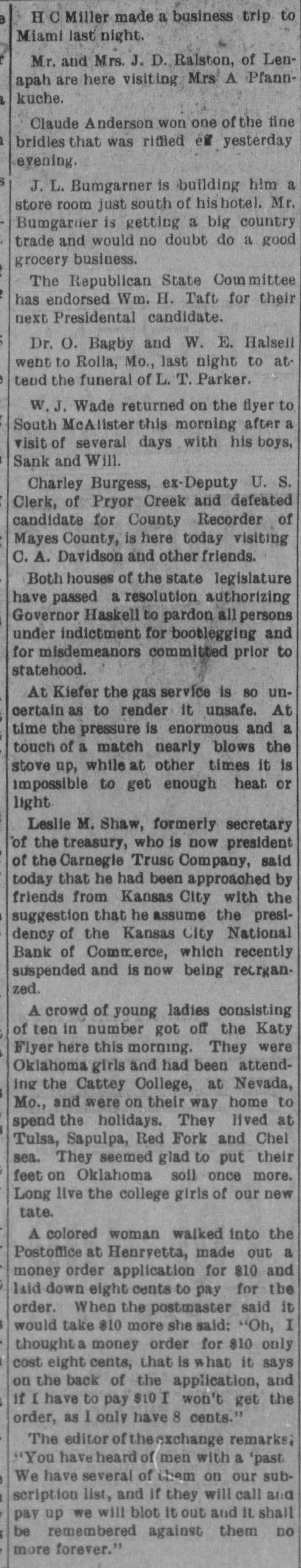 H C Miller made a business trip to Miami last night. Mr. and Mrs. J. D. Ralston, of Lenapah are here visiting Mrs A Pfannkuche. Claude A inderson won one of the fine bridles that was riffied ef yesterday evening. J. L. Bumgarner is building him a store room just south of shotel. Mr. Bumgarder is getting a big country trade and would no doubt do a good grocery business. The Republican State Com mittee has endorsed Wm. H. Taft for their next Presidental candidate. Dr. O. Bagby and W. E. Halsell went to Rolla, Mo., last night to attend the funeral of L. T. Parker. W. J. Wade returned on the flyer to South McAlister this morning after a visit of several days with his boys, Sank and Will. Charley Burgess, ex-Deputy U. S. Clerk, of Pryor Creek and defeated candidate for County Recorder of Mayes County, is here today visiting C. A. Davidson and other friends. Both houses of the state legislature have passed a resolution authorizing Governor Haskell to pardon all persons under indictment for bootlegging and for misdemeanors committed prior to statehood. At Kiefer the gas service is so uncertain as to render it unsafe. At time the pressure is enormous and a touch of a match nearly blows the stove up, while at other times it is impossible to get enough heat or light Leslie M. Shaw, formerly secretary of the treasury, who is now president of the Carnegie Trust Company, said today that he had been approached by friends from Kansas City with the suggestion that he assume the presidency of the Kansas City National Bank of Commerce, which recently suspended and is now being recrganzed. A crowd of young ladies consisting of ten in number got off the Katy Flyer here this morning. They were Oklahoma girls and had been attending the Cattey College, at Nevada, Mo., and were on their way home to spend the holidays. They lived at Tulsa, Sapulpa, Red Fork and Chel sea. They seemed glad to put their feet on Oklahoma soil once more. Long live the college girls of our new tate. A colored woman walked into the Postoffice at Henryetta, made out a money order application for $10 and laid down eight cents to pay for the order. When the postmaster said it would take $10 more she said: "Oh, I thought a money order for $10 only cost eight cents, that is what it says on the back of the application, and if I have to pay $10 I won't get the order, as I only have 8 cents." The editor of the exchange remarks; 'You have heard of men with a 'past, We have several of them on our subscription list, and if they will call and pay up we will blot it out and it shall be remembered against them no more forever."