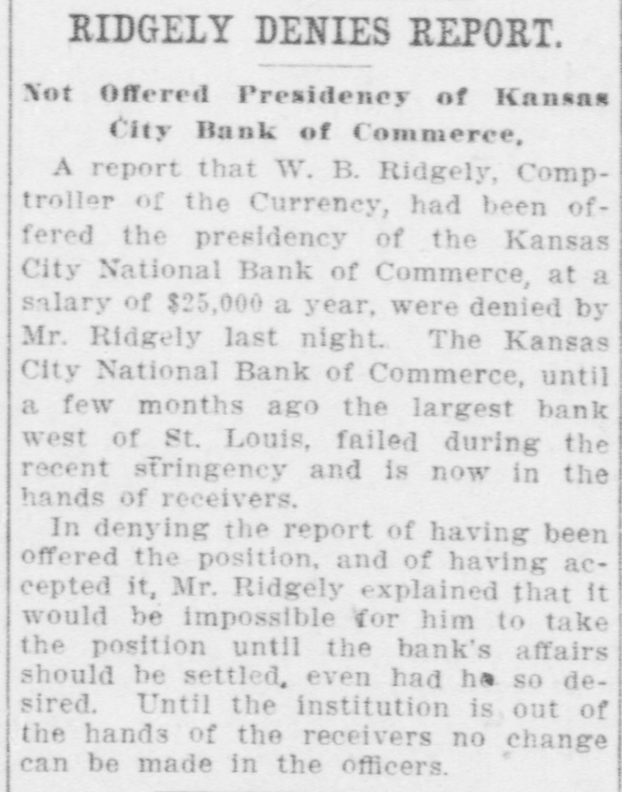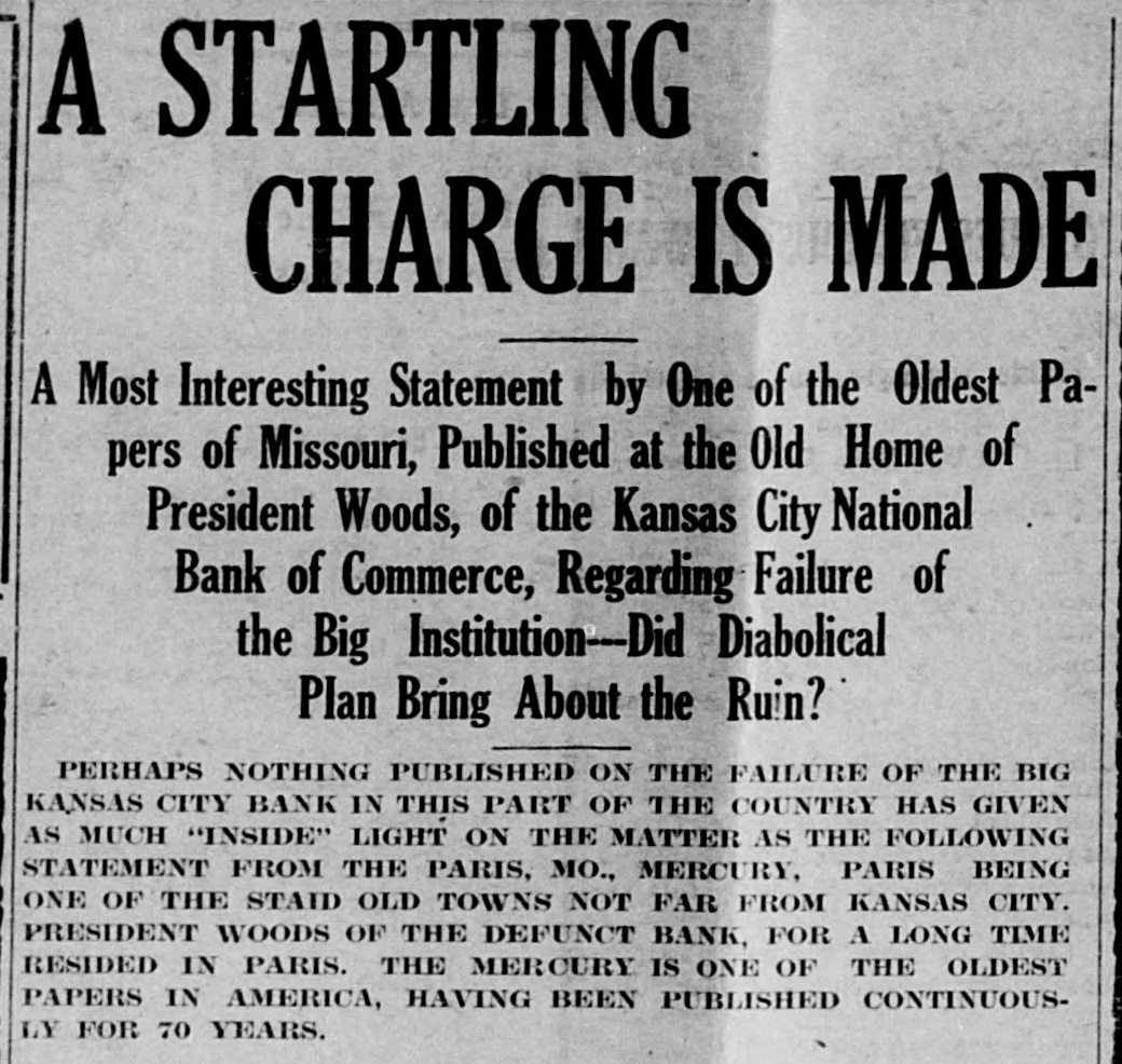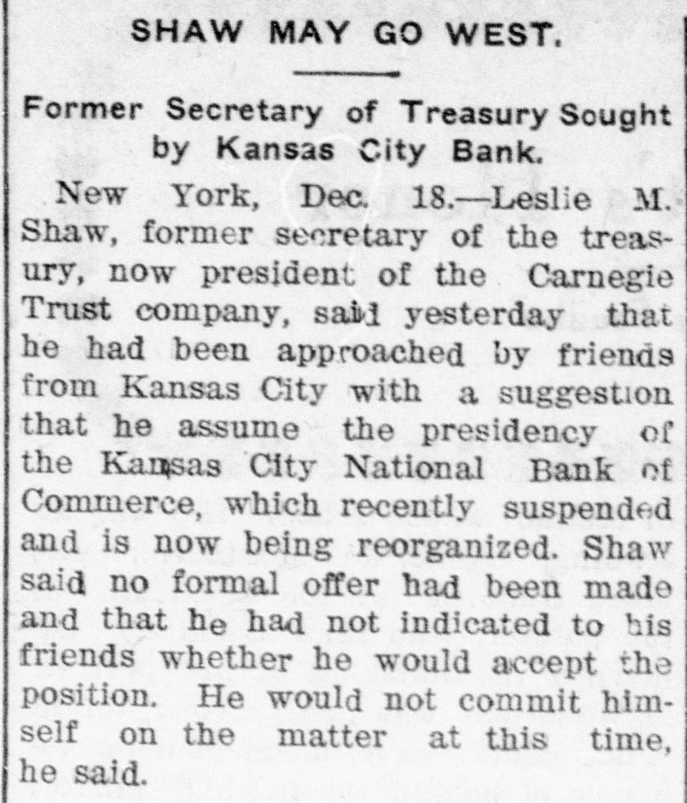 H C Miller made a business trip to Miami last night. Mr. and Mrs. J. D. Ralston, of Lenapah are here visiting Mrs A Pfannkuche. Claude A inderson won one of the fine bridles that was riffied ef yesterday evening. J. L. Bumgarner is building him a store room just south of shotel. Mr. Bumgarder is getting a big country trade and would no doubt do a good grocery business. The Republican State Com mittee has endorsed Wm. H. Taft for their next Presidental candidate. Dr. O. Bagby and W. E. Halsell went to Rolla, Mo., last night to attend the funeral of L. T. Parker. W. J. Wade returned on the flyer to South McAlister this morning after a visit of several days with his boys, Sank and Will. Charley Burgess, ex-Deputy U. S. Clerk, of Pryor Creek and defeated candidate for County Recorder of Mayes County, is here today visiting C. A. Davidson and other friends. Both houses of the state legislature have passed a resolution authorizing Governor Haskell to pardon all persons under indictment for bootlegging and for misdemeanors committed prior to statehood. At Kiefer the gas service is so uncertain as to render it unsafe. At time the pressure is enormous and a touch of a match nearly blows the stove up, while at other times it is impossible to get enough heat or light Leslie M. Shaw, formerly secretary of the treasury, who is now president of the Carnegie Trust Company, said today that he had been approached by friends from Kansas City with the suggestion that he assume the presidency of the Kansas City National Bank of Commerce, which recently suspended and is now being recrganzed. A crowd of young ladies consisting of ten in number got off the Katy Flyer here this morning. They were Oklahoma girls and had been attending the Cattey College, at Nevada, Mo., and were on their way home to spend the holidays. They lived at Tulsa, Sapulpa, Red Fork and Chel sea. They seemed glad to put their feet on Oklahoma soil once more. Long live the college girls of our new tate. A colored woman walked into the Postoffice at Henryetta, made out a money order application for $10 and laid down eight cents to pay for the order. When the postmaster said it would take $10 more she said: "Oh, I thought a money order for $10 only cost eight cents, that is what it says on the back of the application, and if I have to pay $10 I won't get the order, as I only have 8 cents." The editor of the exchange remarks; 'You have heard of men with a 'past, We have several of them on our subscription list, and if they will call and pay up we will blot it out and it shall be remembered against them no more forever."