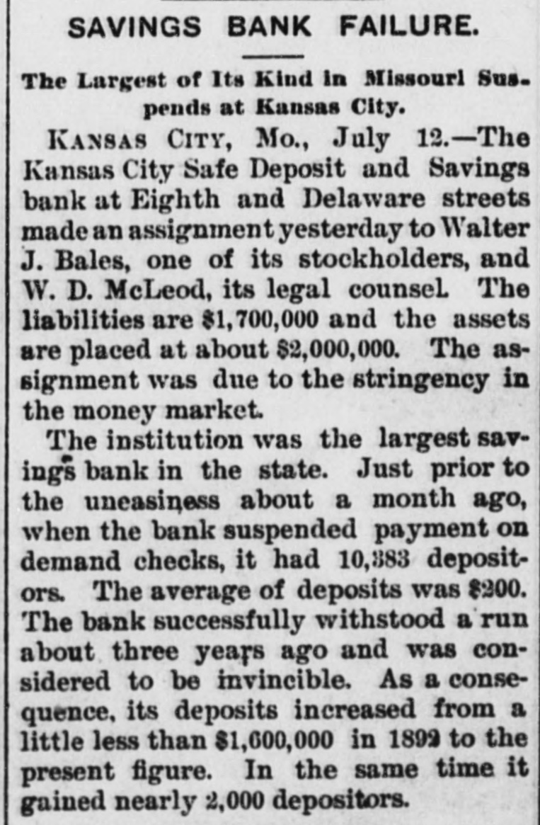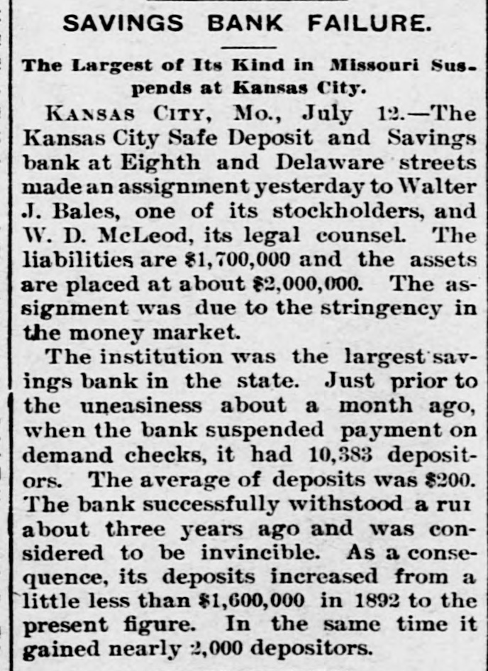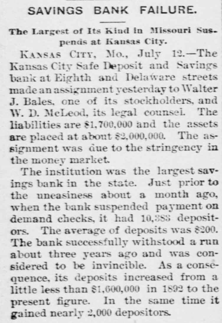 SAVINGS BANK FAILURE. The Largest of Its Kind in Missouri Suspends at Kansas City. KANSAS CITY, Mo., July 12. - The Kansas City Safe Deposit and Savings bank at Eighth and Delaware streets made an assignment yesterday to Walter J. Bales, one of its stockholders, and W. D. McLeod, its legal counsel. The liabilities are $1,700,000 and the assets are placed at about $2,000,000. The assignment was due to the stringency in the money market. The institution was the largest savings bank in the state. Just prior to the uneasiness about a month ago, when the bank suspended payment on demand checks, it had 10,383 depositors. The average of deposits was $200. The bank successfully withstood a rui about three years ago and was considered to be invincible. As a consequence, its deposits increased from a little less than $1,600,000 in 1892 to the present figure. In the same time it gained nearly 2,000 depositors.