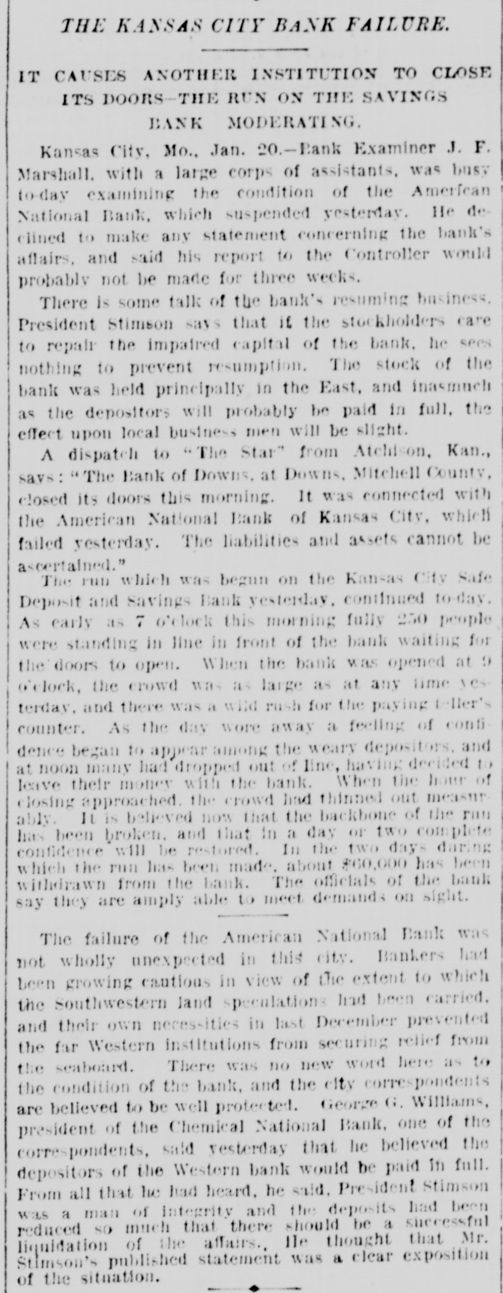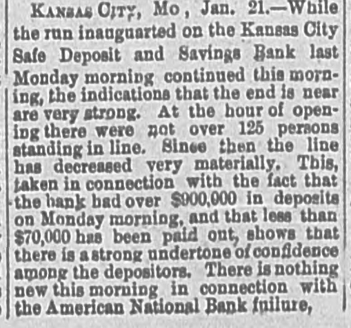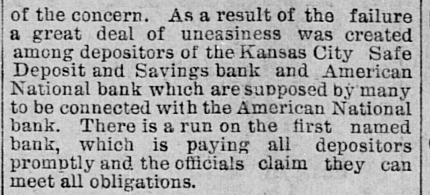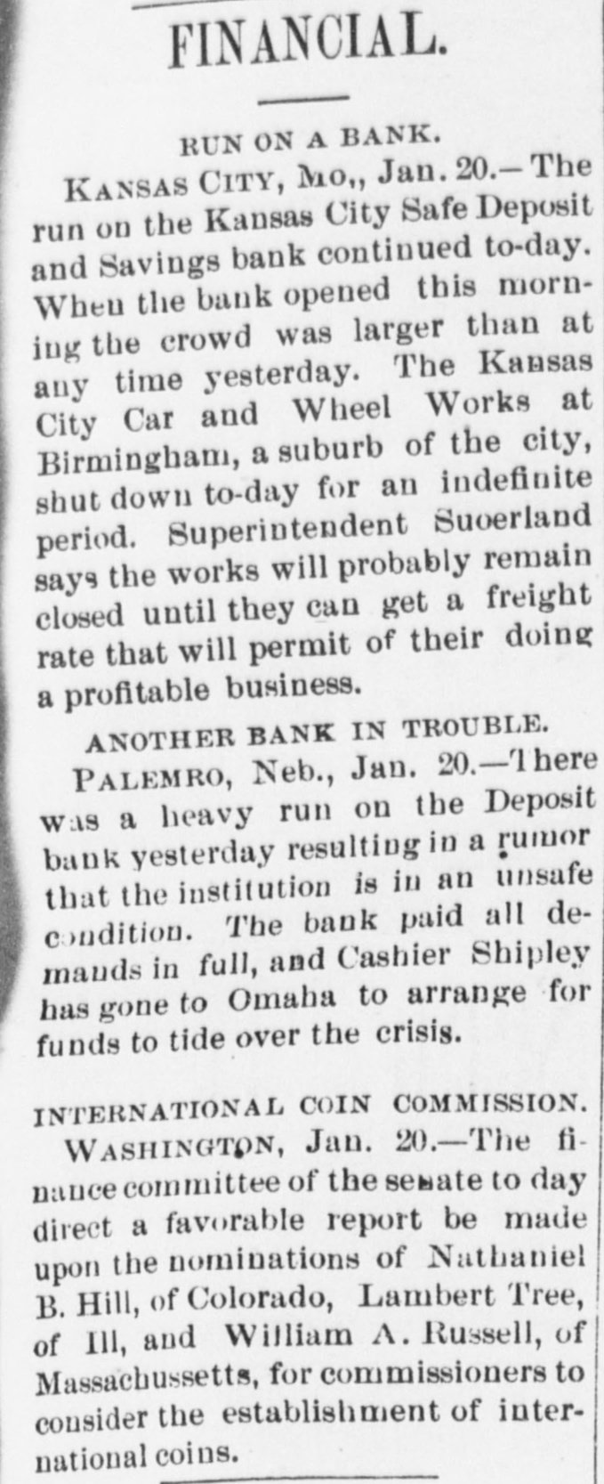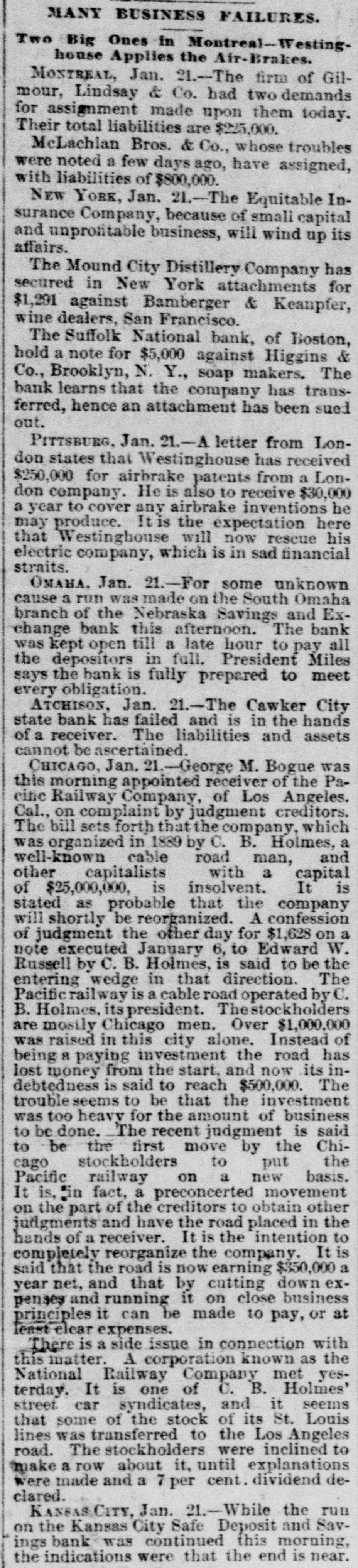 MANY BUSINESS FAILURES. Two Big Ones in Montreal-Westinghouse Applies the Air-Brakes. MONTREAL, Jan. 21.--The firm of Gilmour, Lindsay & Co. had two demands for assignment made upon them today. Their total liabilities are $225,000. McLachian Bros. & Co., whose troubles were noted a few days ago, have assigned, with liabilities of $800,000. NEW YORK, Jan. 21.-The Equitable Insurance Company, because of small capital affairs. and unprontable business, will wind up its The Mound City Distillery Company has secured in New York attachments for $1,291 against Bamberger & Keanpfer, wine dealers, San Francisco. The Suffolk National bank, of Boston, hold a note for $5,000 against Higgins & Co., Brooklyn, N. Y., soap makers. The bank learns that the company has transferred, hence an attachment has been sued out. PITTSBURG. Jan. 21.-A letter from London states that Westinghouse has received $250,000 for airbrake patents from a London company. He is also to receive $30,000 a year to cover any airbrake inventions he may produce. It is the expectation here that Westinghouse will now rescue his electric company, which is in sad financial straits. OMAHA, Jan. 21.-For some unknown cause a run was made on the South Omaha branch of the Nebraska Savings and Exchange bank this afternoon. The bank was kept open till a late hour to pay all the depositors in full. President Miles says the bank is fully prepared to meet every obligation. ATCHISON, Jan. 21.-The Cawker City state bank has failed and is in the hands of a receiver. The liabilities and assets cannot be ascertained. CHICAGO, Jan. 21.-George M. Bogue was this morning appointed receiver of the Pacitic Railway Company, of Los Angeles. Cal., on complaint by judgment creditors. The bill sets forth that the company, which was organized in 1889 by C. B. Holmes, a well-known cable road man, and other capitalists with a capital of $25,000,000, is insolvent. It is stated as probable that the company will shortly be reorganized. A confession of judgment the other day for $1,628 on a note executed January 6, to Edward W. Russell by C. B. Holmes, is said to be the entering wedge in that direction. The Pacific railway is a cable road operated by C. B. Holmes. its president. Thestockholders are mostly Chicago men. Over $1,000,000 was raised in this city alone. Instead of being a paying investment the road has lost money from the start, and now its indebtedness is said to reach $500,000. The trouble seems to be that the investment was too heavy for the amount of business to be done. The recent judgment is said to be the first move by the Chicago stockholders to put the Pacific railway on a new basis. It is, "in fact, a preconcerted movement on the part of the creditors to obtain other judgments and have the road placed in the hands of a receiver. It is the intention to completely reorganize the company. It is said that the road is now earning $350,000 a year net, and that by cutting down expenses and running it on close business principles it can be made to pay, or at least clear expenses. There is a side issue in connection with this matter. A corporation known as the National Railway Company met yesterday. It is one of C. B. Holmes' street car syndicates, and it seems that some of the stock of its St. Louis lines was transferred to the Los Angeles road. The stockholders were inclined to trake a row about it, until explanations were made and a 7 per cent. dividend declared. KANSAS/CITY, Jan. 21.-While the run on the Kansas City Safe Deposit and Savings bank was continued this morning, the indications were that the end is near.