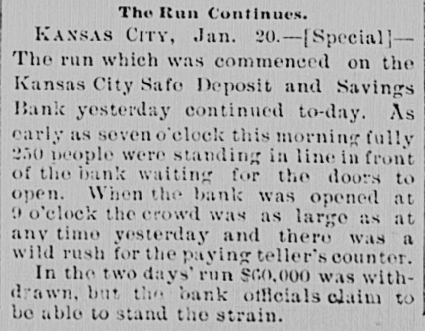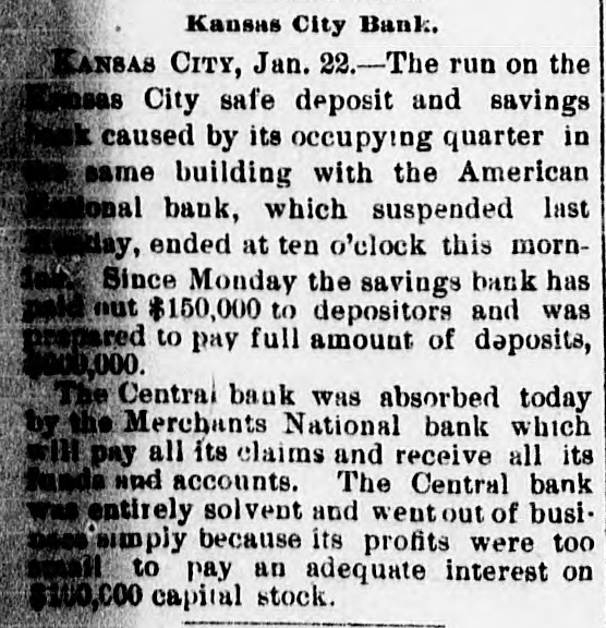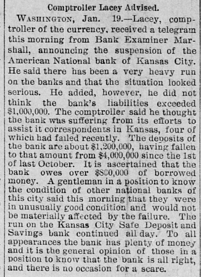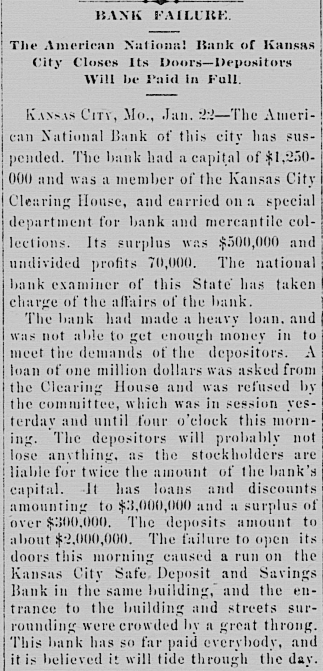 MANY BUSINESS FAILURES. Two Big Ones in Montreal-Westinghouse Applies the Air-Brakes. MONTREAL, Jan. 21.--The firm of Gilmour, Lindsay & Co. had two demands for assignment made upon them today. Their total liabilities are $225,000. McLachian Bros. & Co., whose troubles were noted a few days ago, have assigned, with liabilities of $800,000. NEW YORK, Jan. 21.-The Equitable Insurance Company, because of small capital affairs. and unprontable business, will wind up its The Mound City Distillery Company has secured in New York attachments for $1,291 against Bamberger & Keanpfer, wine dealers, San Francisco. The Suffolk National bank, of Boston, hold a note for $5,000 against Higgins & Co., Brooklyn, N. Y., soap makers. The bank learns that the company has transferred, hence an attachment has been sued out. PITTSBURG. Jan. 21.-A letter from London states that Westinghouse has received $250,000 for airbrake patents from a London company. He is also to receive $30,000 a year to cover any airbrake inventions he may produce. It is the expectation here that Westinghouse will now rescue his electric company, which is in sad financial straits. OMAHA, Jan. 21.-For some unknown cause a run was made on the South Omaha branch of the Nebraska Savings and Exchange bank this afternoon. The bank was kept open till a late hour to pay all the depositors in full. President Miles says the bank is fully prepared to meet every obligation. ATCHISON, Jan. 21.-The Cawker City state bank has failed and is in the hands of a receiver. The liabilities and assets cannot be ascertained. CHICAGO, Jan. 21.-George M. Bogue was this morning appointed receiver of the Pacitic Railway Company, of Los Angeles. Cal., on complaint by judgment creditors. The bill sets forth that the company, which was organized in 1889 by C. B. Holmes, a well-known cable road man, and other capitalists with a capital of $25,000,000, is insolvent. It is stated as probable that the company will shortly be reorganized. A confession of judgment the other day for $1,628 on a note executed January 6, to Edward W. Russell by C. B. Holmes, is said to be the entering wedge in that direction. The Pacific railway is a cable road operated by C. B. Holmes. its president. Thestockholders are mostly Chicago men. Over $1,000,000 was raised in this city alone. Instead of being a paying investment the road has lost money from the start, and now its indebtedness is said to reach $500,000. The trouble seems to be that the investment was too heavy for the amount of business to be done. The recent judgment is said to be the first move by the Chicago stockholders to put the Pacific railway on a new basis. It is, "in fact, a preconcerted movement on the part of the creditors to obtain other judgments and have the road placed in the hands of a receiver. It is the intention to completely reorganize the company. It is said that the road is now earning $350,000 a year net, and that by cutting down expenses and running it on close business principles it can be made to pay, or at least clear expenses. There is a side issue in connection with this matter. A corporation known as the National Railway Company met yesterday. It is one of C. B. Holmes' street car syndicates, and it seems that some of the stock of its St. Louis lines was transferred to the Los Angeles road. The stockholders were inclined to trake a row about it, until explanations were made and a 7 per cent. dividend declared. KANSAS/CITY, Jan. 21.-While the run on the Kansas City Safe Deposit and Savings bank was continued this morning, the indications were that the end is near.
