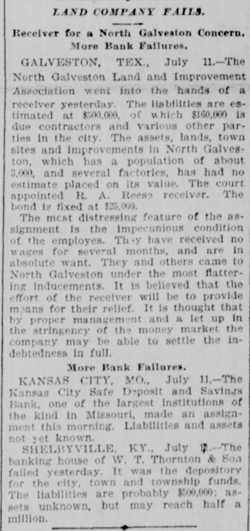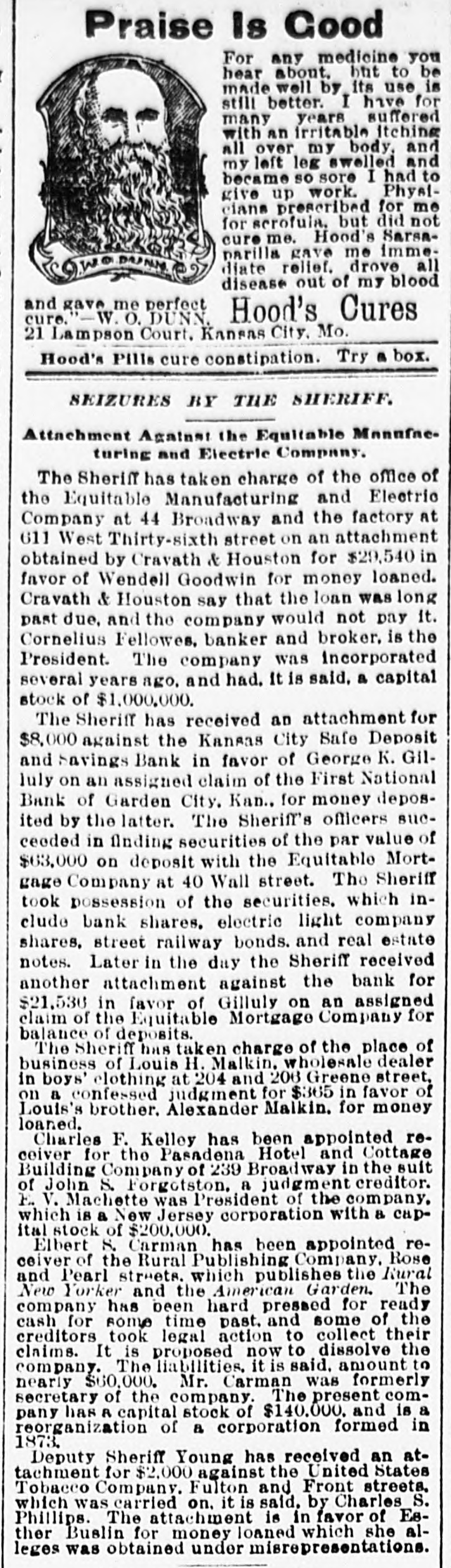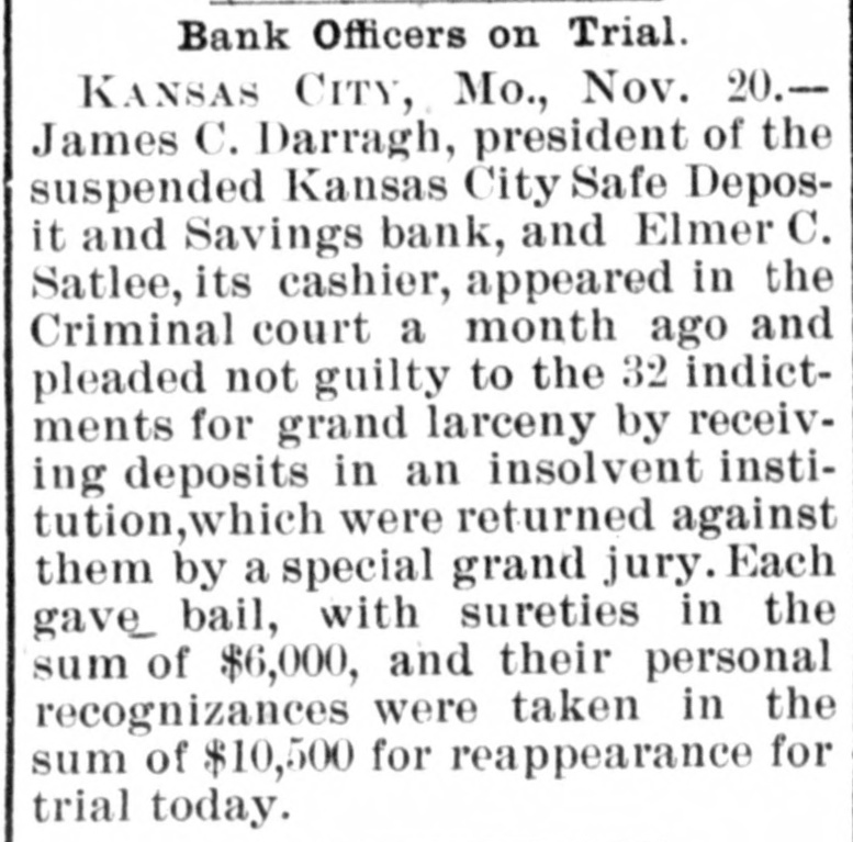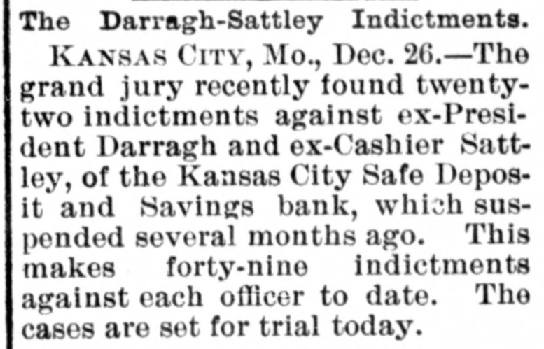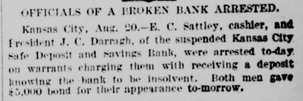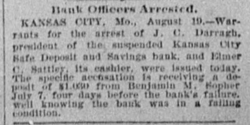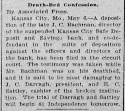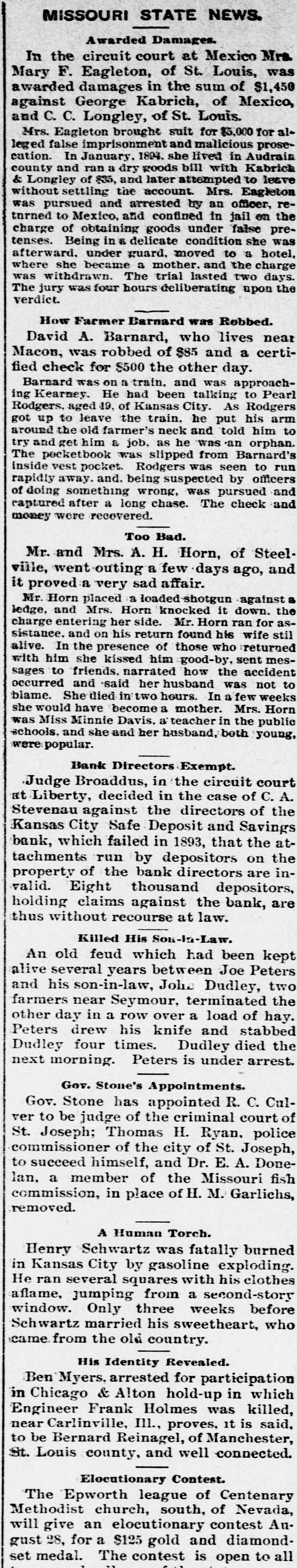MISSOURI STATE NEWS. Awarded Damages. In the circuit court at Mexico Mrs. Mary F. Eagleton, of St. Louis, was awarded damages in the sum of $1,450 against George Kabrich, of Mexico, and C. C. Longley, of St. Louis. Mrs. Eagleton brought suit for $5,000 for alleged false imprisonment and malicious prosecution. In January. 1894. she lived in Audrain county and ran a dry goods bill with Kabrich & Longley of $35, and later attempted to leave without settling the account. Mrs. Eagleton was pursued and arrested by an officer, returned to Mexico, and confined in jail on the charge of obtaining goods under false pretenses. Being in & delicate condition she was afterward. under guard, moved to a hotel, where she became a mother. and the charge was withdrawn. The trial lasted two days. The verdict. jury was four hours deliberating upon the How Farmer Barnard was Robbed. David A. Barnard, who lives near Macon, was robbed of $85 and a certified check for $500 the other day. Barnard was on a train, and was approaching Kearney. He had been talking to Pearl Rodgers, aged 19, of Kansas City. As Rodgers got up to leave the train. he put his arm around the old farmer's neck and told him to try and get him a job, as he was an orphan. The pecketbook was slipped from Barnard's inside vest pocket. Rodgers was seen to run rapidly away. and. being suspected by officers of doing something wrong, was pursued and captured after a long chase. The check and money were recovered. Too Bad. Mr. and Mrs. A. H. Horn, of Steelville, went outing a few days ago, and it proved a very sad affair. Mr. Horn placed a loaded-shotgun against a ledge, and Mrs. Horn knocked it down. the charge entering her side. Mr. Horn ran for assistance. and on his return found his wife stil alive. In the presence of those who returned with him she kissed him good-by, sent messages to friends, narrated how the accident occurred and said her husband was not to blame. She died in two hours. In a few weeks she would have become a mother. Mrs. Horn was Miss Minnie Davis. a teacher in the public schools. and she and her husband, both young, were popular. Bank Directors Exempt. Judge Broaddus, in the circuit court at Liberty, decided in the case of C. A. Stevenau against the directors of the Kansas City Safe Deposit and Savings bank, which failed in 1893, that the attachments run by depositors on the property of the bank directors are invalid. Eight thousand depositors, holding claims against the bank, are thus without recourse at law. Killed His Son-in-Law. An old feud which had been kept alive several years between Joe Peters and his son-in-law, John Dudley, two farmers near Seymour, terminated the other day in a row over a load of hay. Peters drew his knife and stabbed Dudley four times. Dudley died the next morning. Peters is under arrest. Gov. Stone's Appointments. Gov. Stone has appointed R. C. Culver to be judge of the criminal court of St. Joseph; Thomas H. Ryan. police commissioner of the city of St. Joseph, to succeed himself, and Dr. E. A. Donelan, a member of the Missouri fish commission, in place of H. M. Garlichs, removed. A Human Torch. Henry Schwartz was fatally burned in Kansas City by gasoline exploding. He ran several squares with his clothes aflame, jumping from a second-story window. Only three weeks before Schwartz married his sweetheart, who came from the old country. His Identity Revealed. Ben Myers, arrested for participation in Chicago & Alton hold-up in which Engineer Frank Holmes was killed, near Carlinville, Ill., proves, it is said, to be Bernard Reinagel, of Manchester, St. Louis county, and well connected. Elocutionary Contest. The Epworth league of Centenary Methodist church, south, of Nevada, will give an elocutionary contest August 28, for a $125 gold and diamondset medal. The contest is open to all